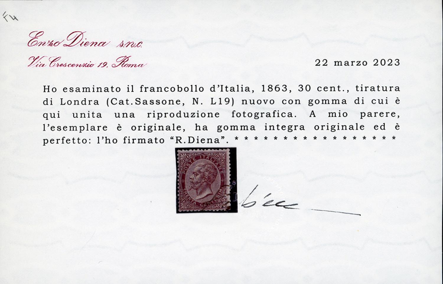 1863 - 30 cent. De La Rue, tiratura di Londra (L19), gomma originale integra, perfetto e molto fresco. Raro e di ottima qualità. Cert. ... Leggi tutto