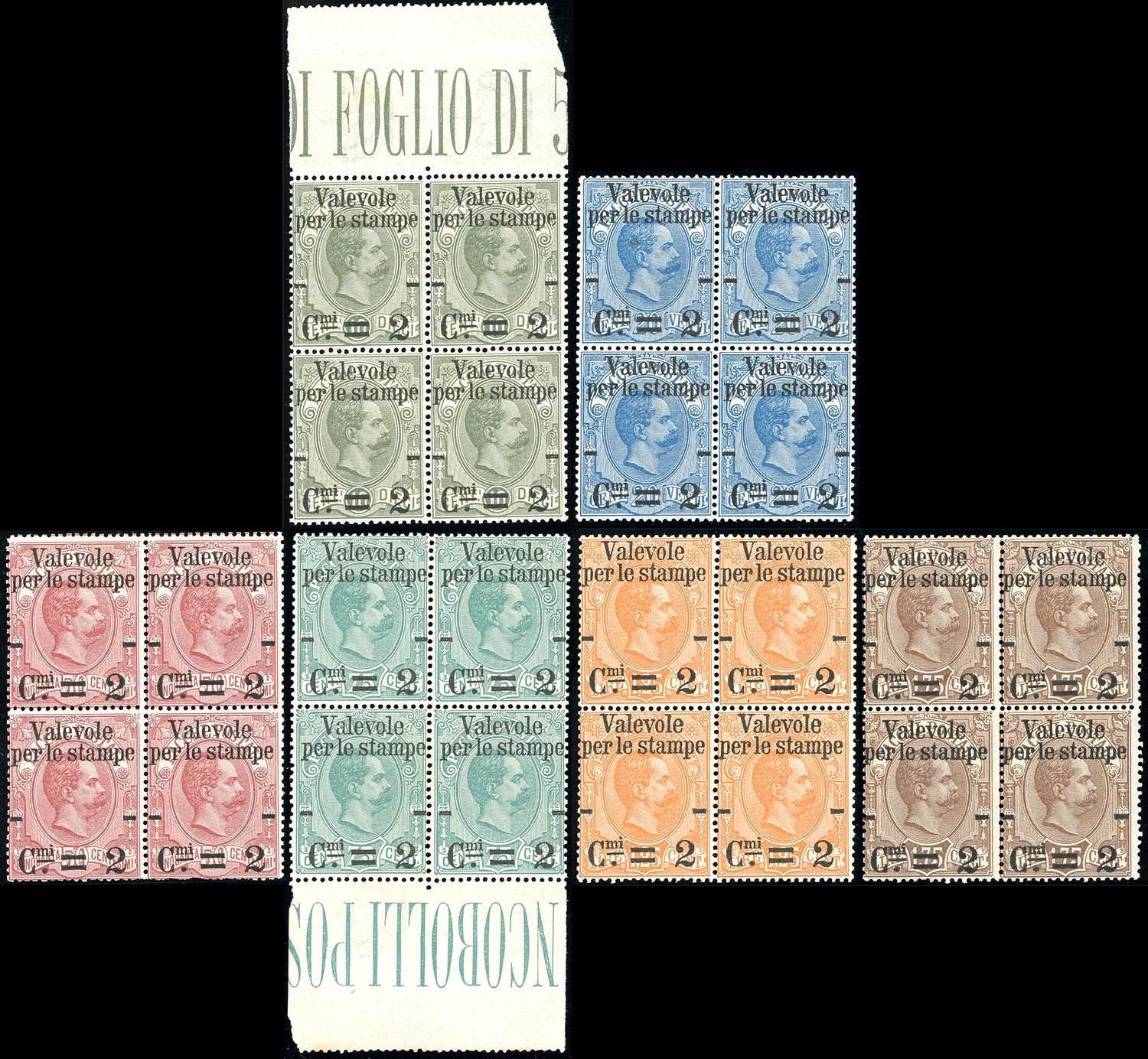 1890 - Soprastampati Valevole per le Stampe (50/55), blocchi di quattro, gomma originale integra. Un esemplare ha la dentellatura in basso ... Leggi tutto
