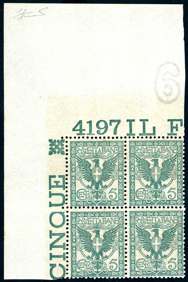 1901 - 5 cent. verde Floreale, blocco di quattro angolo di foglio integrale superiore sinsitro con numero di tavola 4197 (70), nuovo, gomma ... Leggi tutto