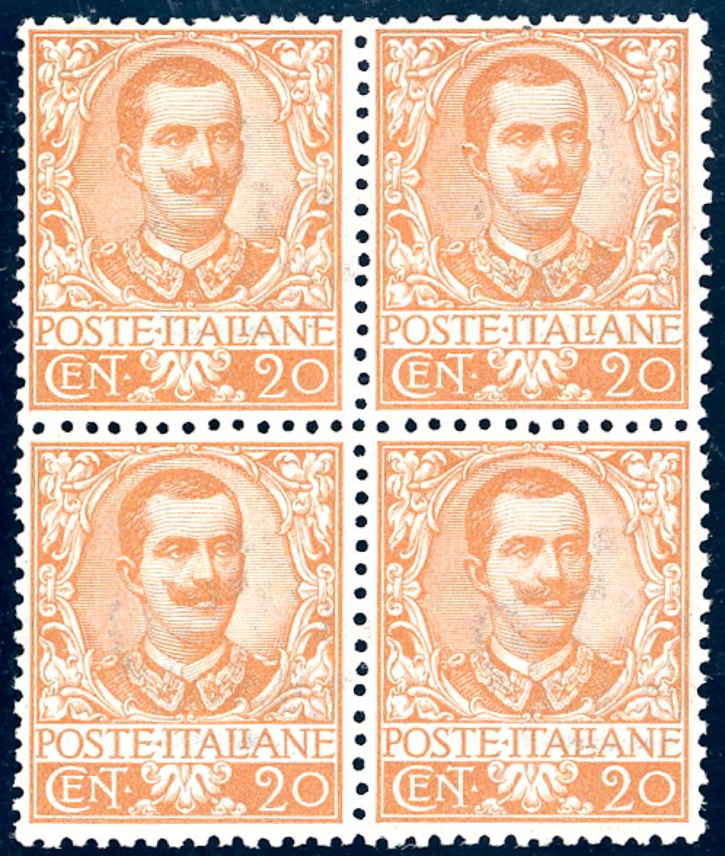 Lotto 828 - 1901 - 20 cent. arancio Floreale (72), blocco di quattro ...