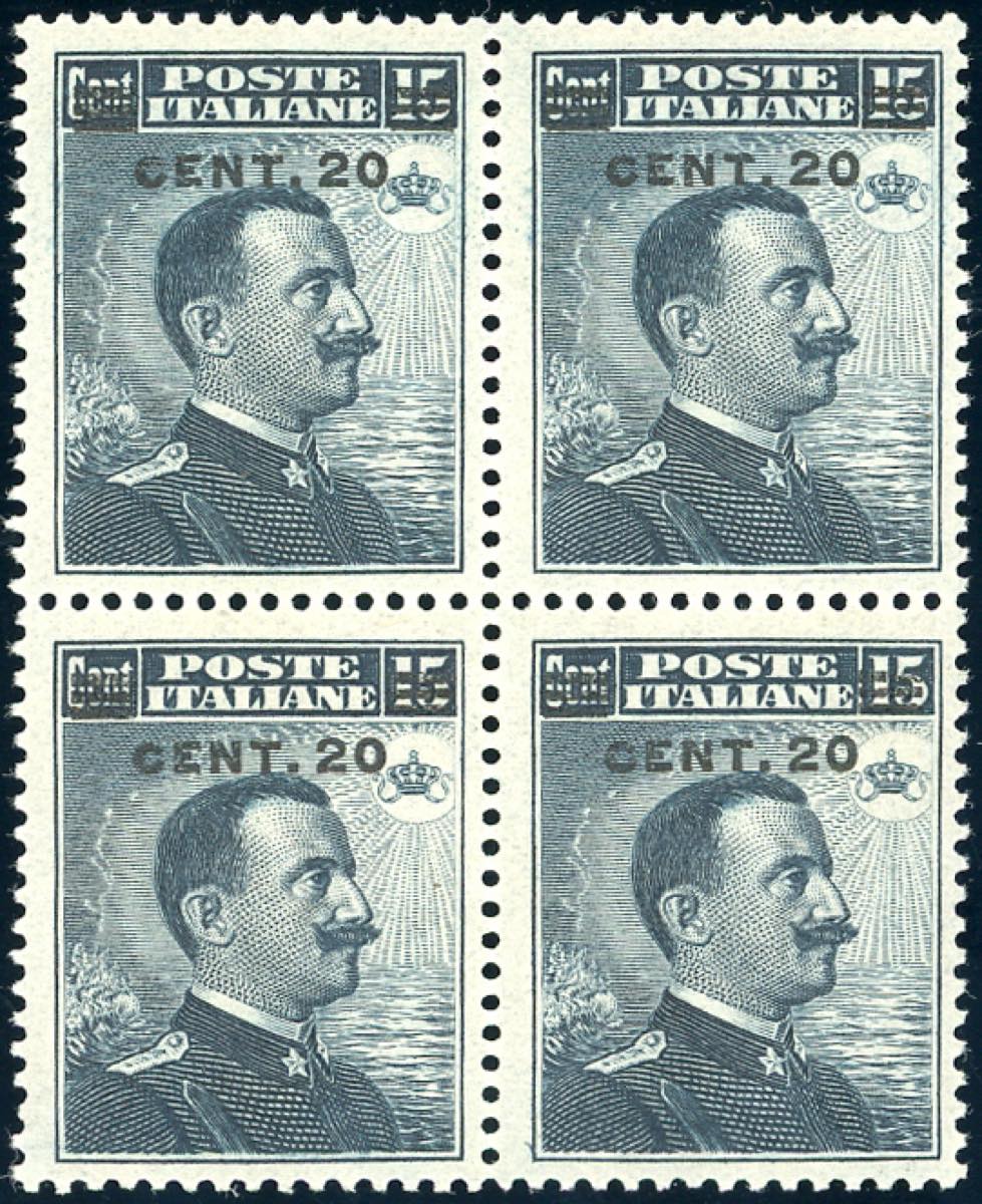 1916 - 20 cent. su 15 cent. Michetti (106), ben centrato, blocco di quattro, gomma originale integra, perfetto. Ferrario