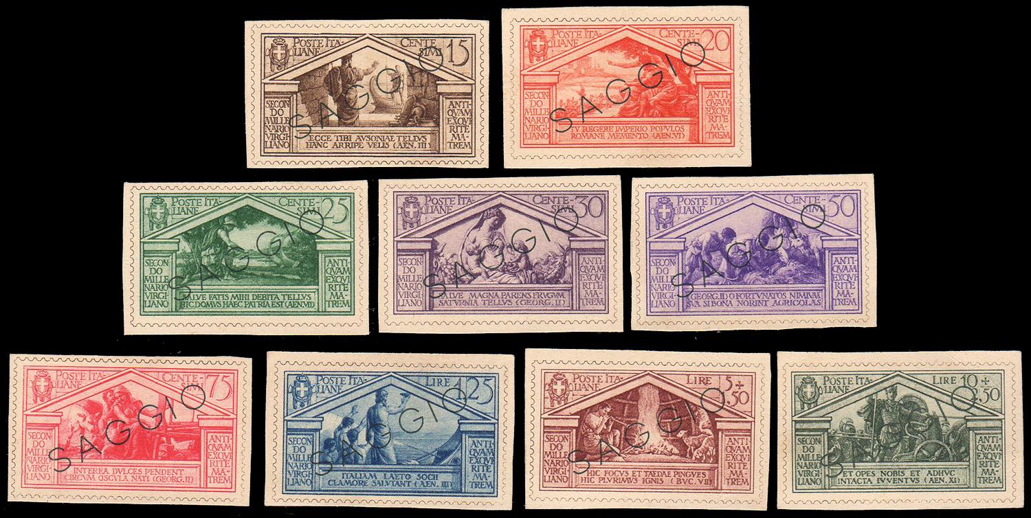 1930 - Virgilio (282/290), serie completa, stampati su cartoncino, non dentellati, con dicitura SAGGIO, provenienti da opuscolo informativo distribuito negli uffici postali. Curiosità.
