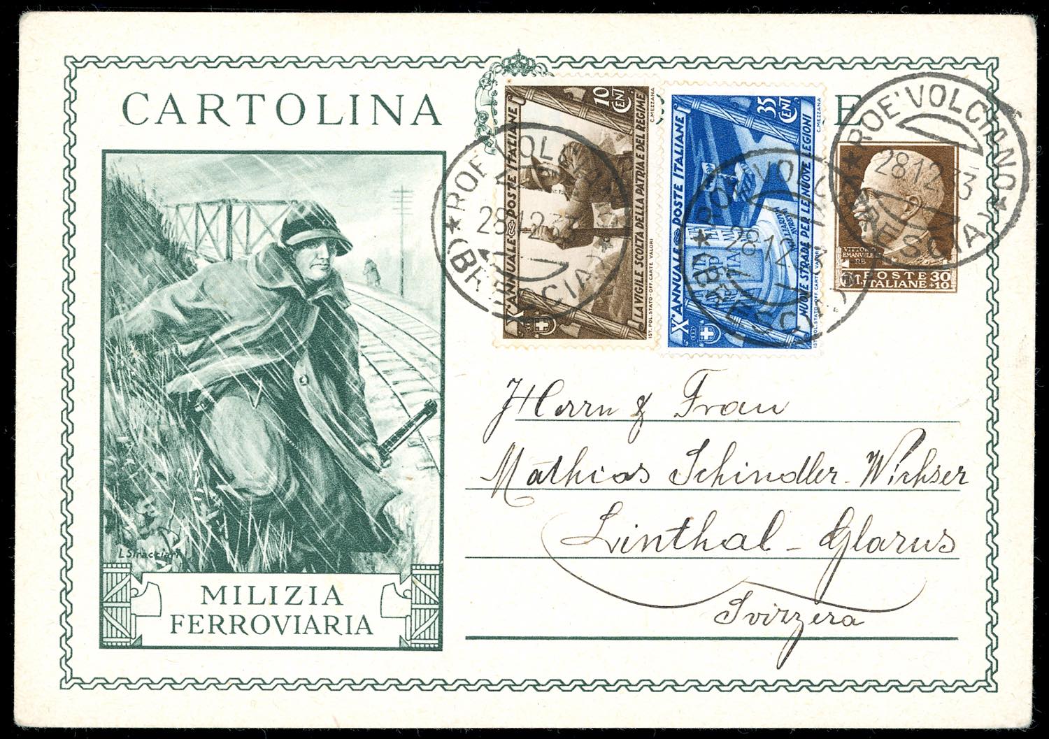 1933 - 10 cent. e 35 cent. Marcia su Roma (326,331), perfetti, ad integrazione di cartolina postale da 30 + 10 cent. Milizia ferroviaria, vignetta verde (Filigrano C77C4), da Roè Volciano 28/12/1933 per la Svizzera. Non comune.