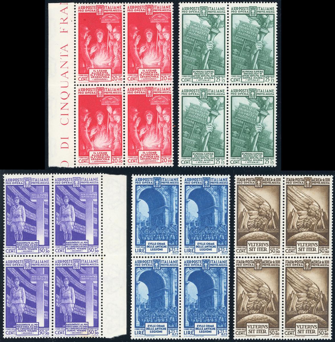 1935 - Milizia IV emissione, serie completa (380/383+A), blocchi di quattro, gomma originale integra, perfetti. Bellissimi. Ferrario.