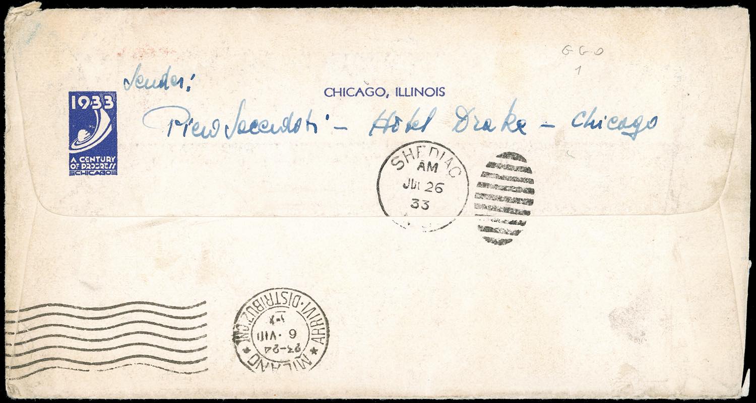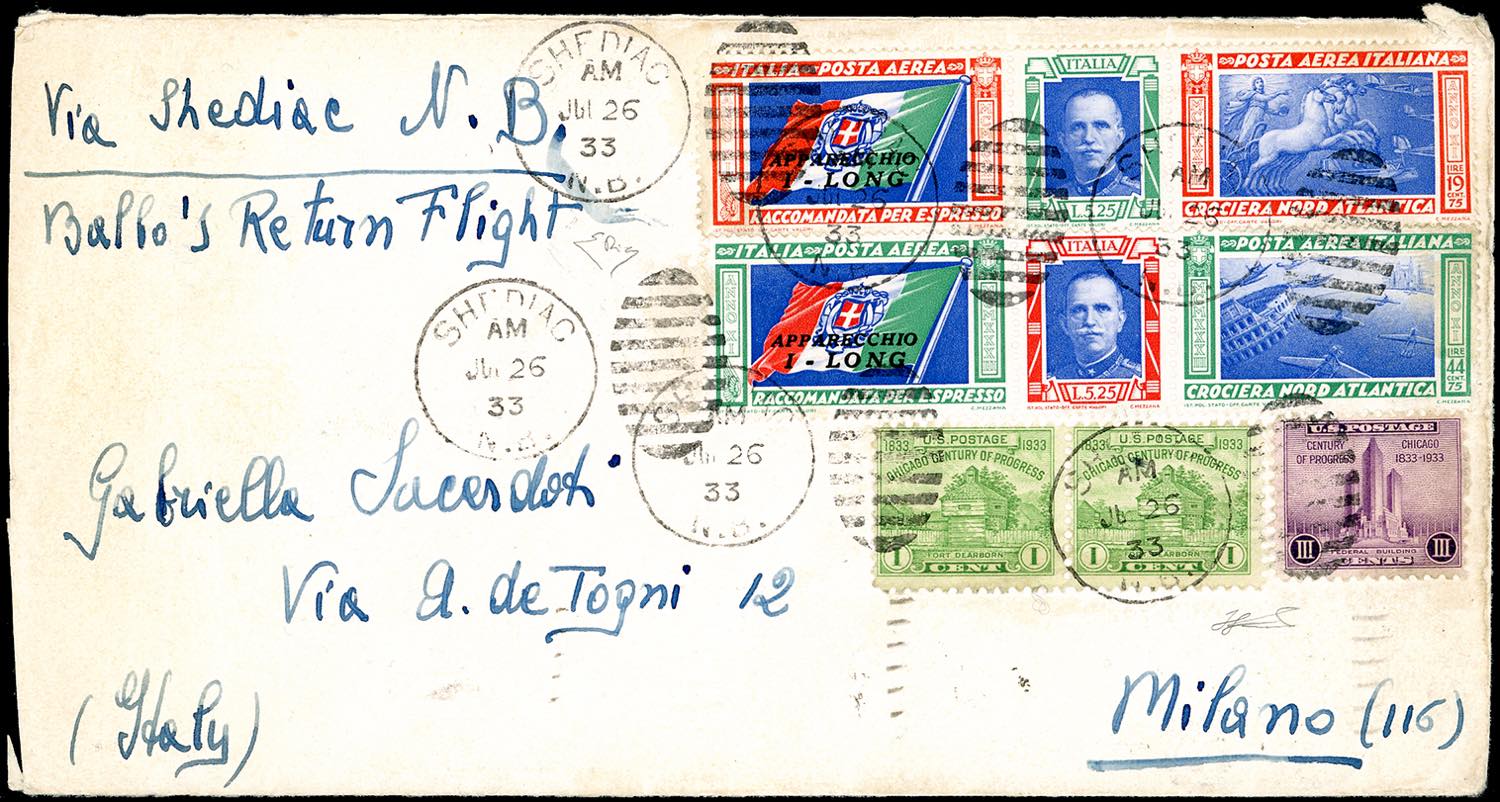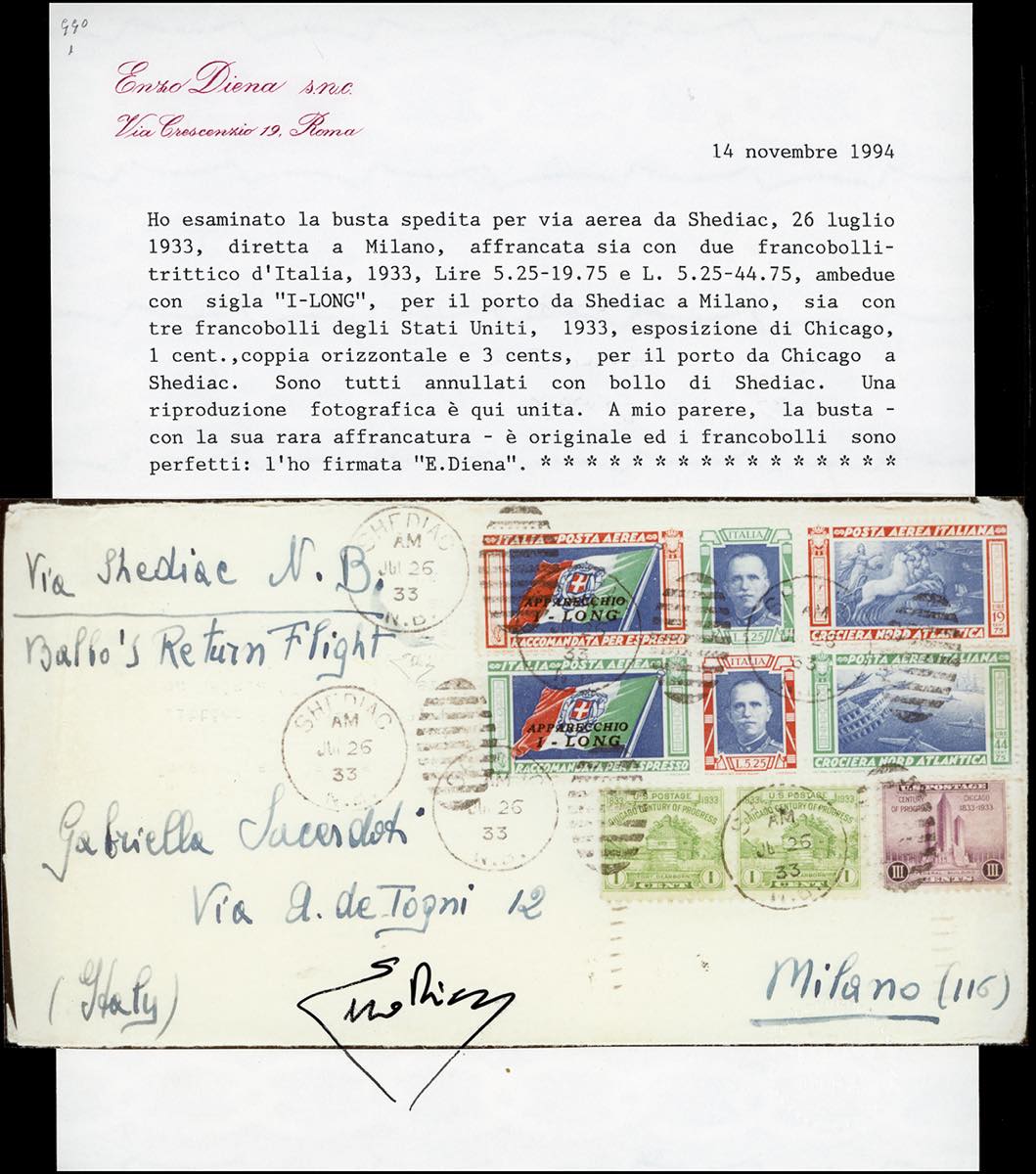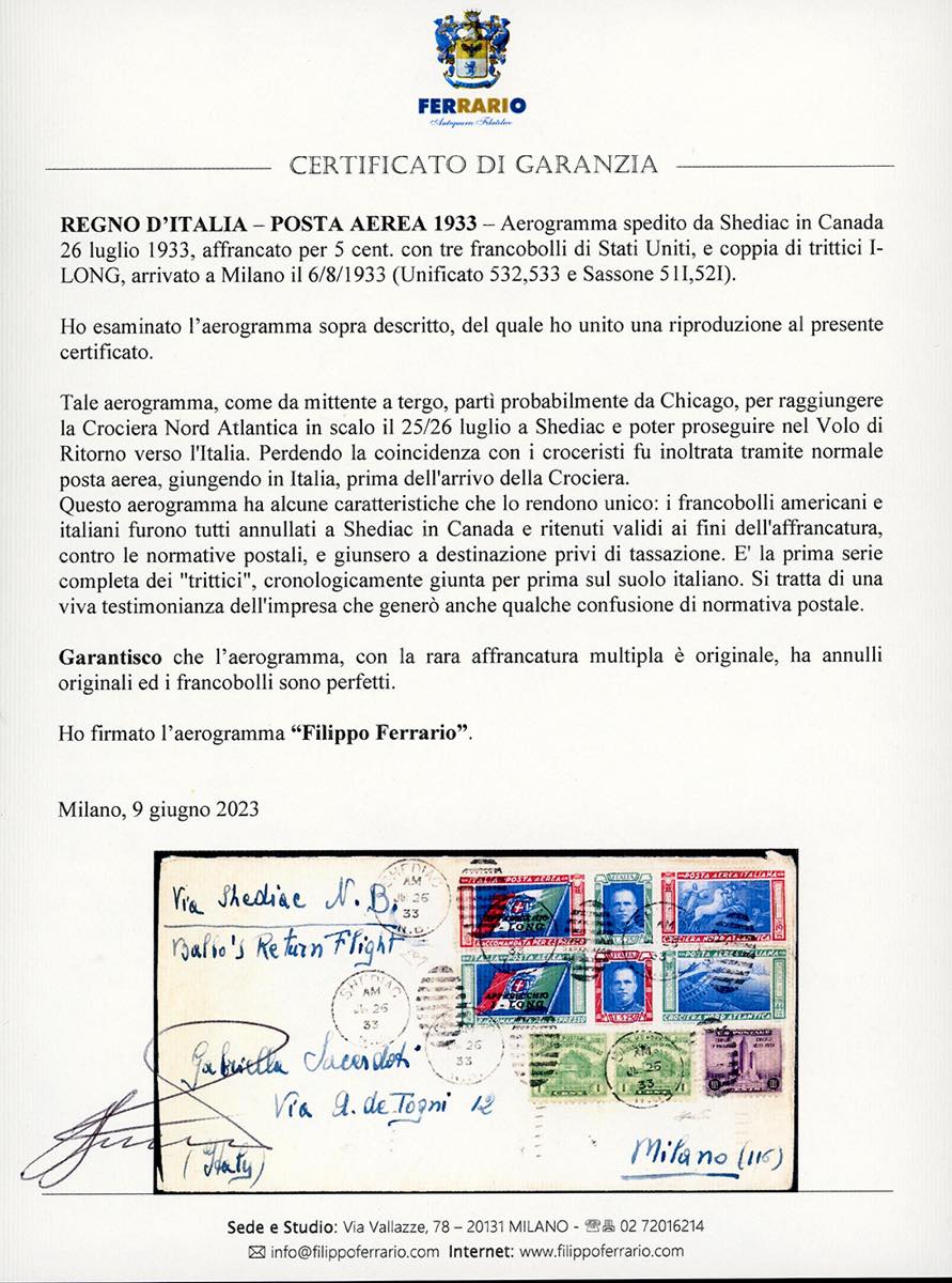 VOLO DI RITORNO 1933 - Aerogramma spedito da Shediac in Canada 26 luglio 1933, affrancato per 5 cent. con tre francobolli di Stati Uniti (532,533), e coppia di trittici I-LONG (51I,52I), perfetti, arrivato a Milano il 6/8/1933. Tale aerogramma, come da mittente a tergo, partì probabilmente da Chicago, per raggiungere la Crociera Nord Atlantica in scalo il 25/26 luglio a Shediac e poter proseguire nel Volo di Ritorno verso l'Italia. Perdendo la coincidenza con i croceristi fu inoltrata tramite normale posta aerea, giungendo in Italia, prima dell'arrivo della Crociera. Questo aerogramma ha alcune caratteristiche che lo rendono unico: i francobolli americani e italiani furono tutti annullati a Shediac in Canada e ritenuti validi ai fini dell'affrancatura, contro le normative postali, e giunsero a destinazione privi di tassazione. E' la prima serie completa dei "trittici", cronologicamente giunta per prima sul suolo italiano. Si tratta di una viva testimonianza dell'impresa che generò anche qualche confusione di normativa postale. Per importante collezione specializzata. Cert. E.Diena e Ferrario.