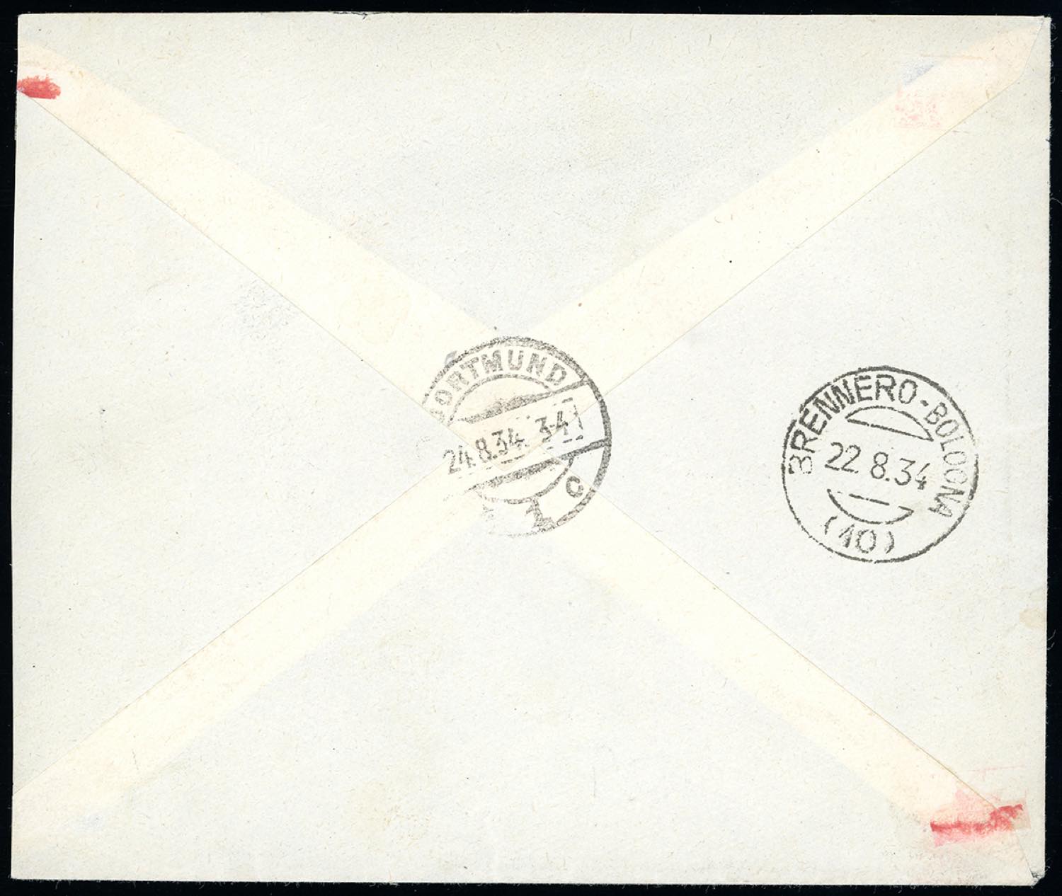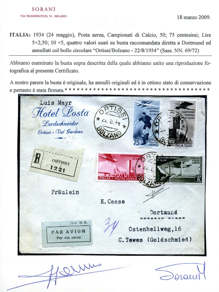 1934 - Mondiali di calcio, serie completa di posta aerea (69/72), perfetti, su fresco aerogramma raccomadato da Ortisei 22/8/1934 a Dortmund, bolli d'arrivo. Cert. Sorani.