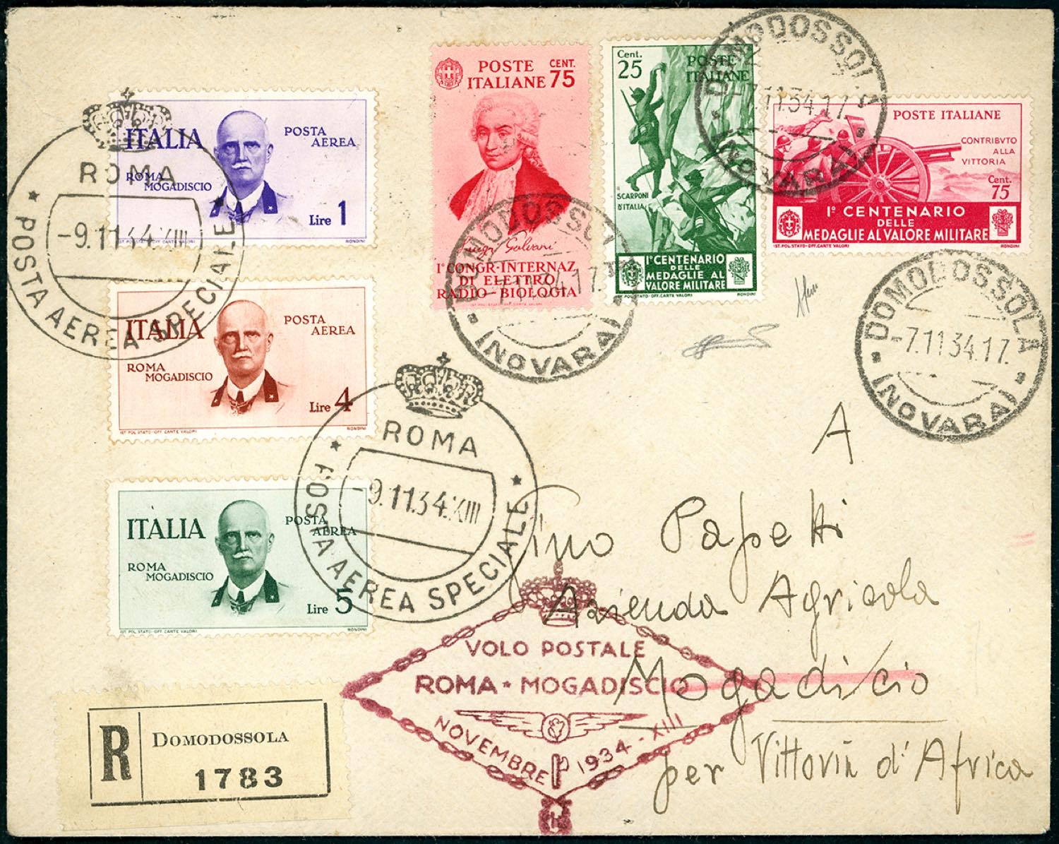 1934 - 1 lira, 4 lire, 5 lire Volo Roma-Mogadiscio, con complementari (83,85,86), perfetti, su aerogramma raccomandato da Domodossola 7/11/1934 a Mogadiscio, bolli speciali del volo. Cert. Ferrario.