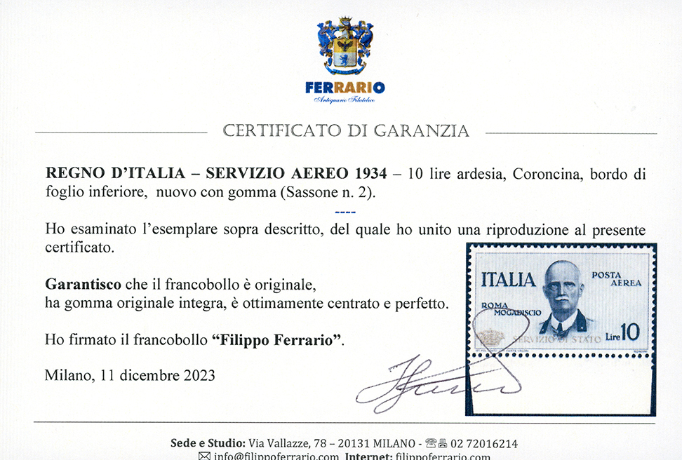 1934 - 10 lire Coroncina (2), ottima centratura, bordo di foglio, gomma originale integra, perfetto. A.Diena, cert. Ferrario.
