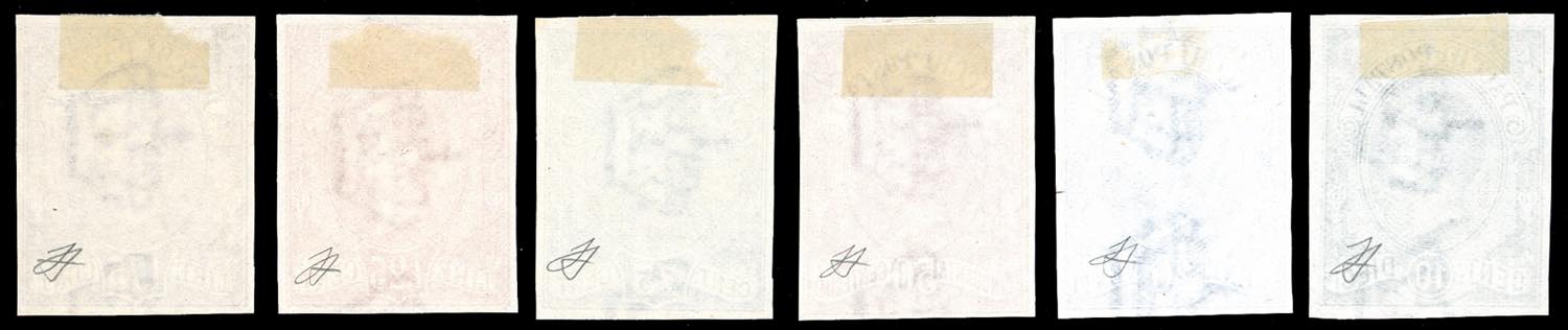 1884/86 - Umberto I, prove d'archivio, non dentellate, serie completa (P1/P6), gomma originale, perfette e molto fresche. Rare. Cert. Ferrario.