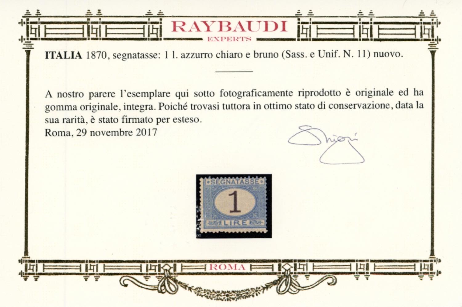 1870 - 1 lira azzurro chiaro e bruno (11), gomma integra, perfetto. Molto fresco. A.Diena, G.Oliva, cert. Oro Raybaudi.