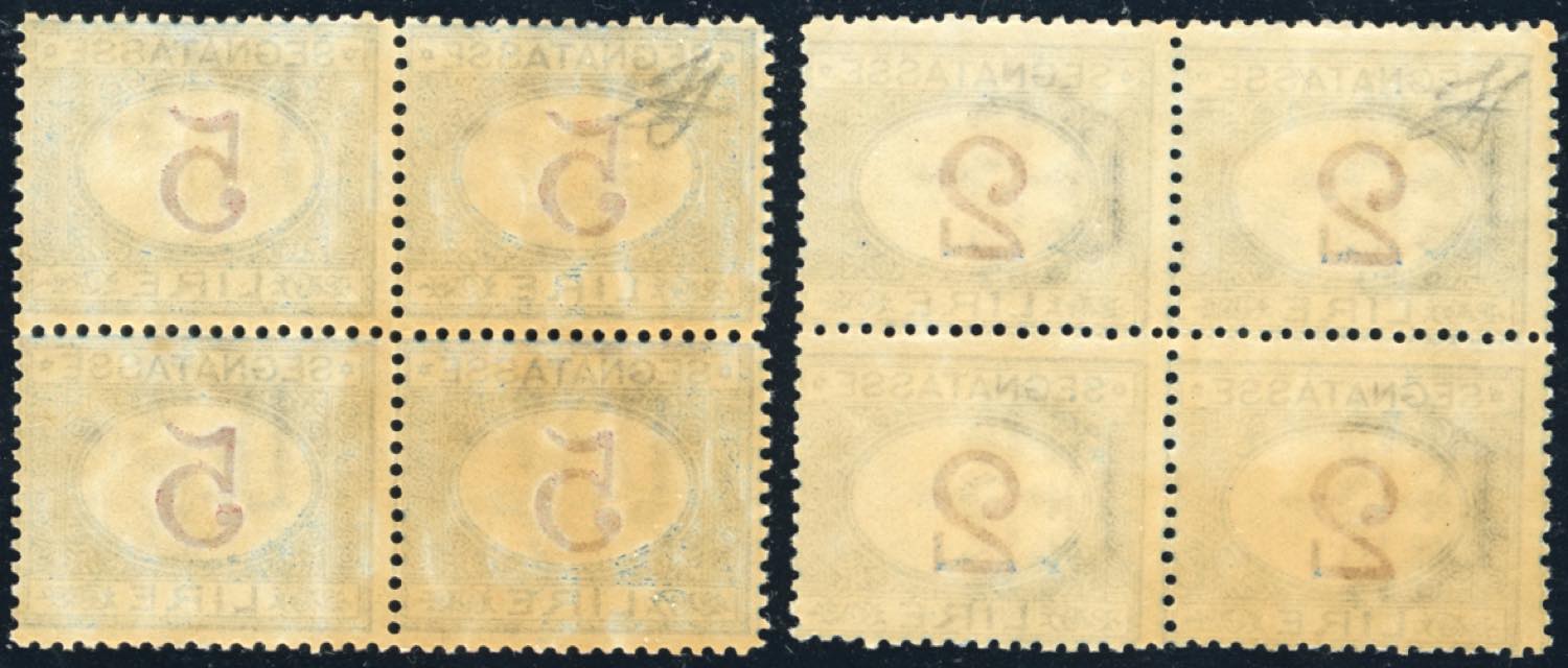 1903 - 2 e 5 lire azzurro e carminio (29/30), blocchi di quattro perfetti, gomma originale integra. Molto freschi e non comuni in blocchi. ... Leggi tutto