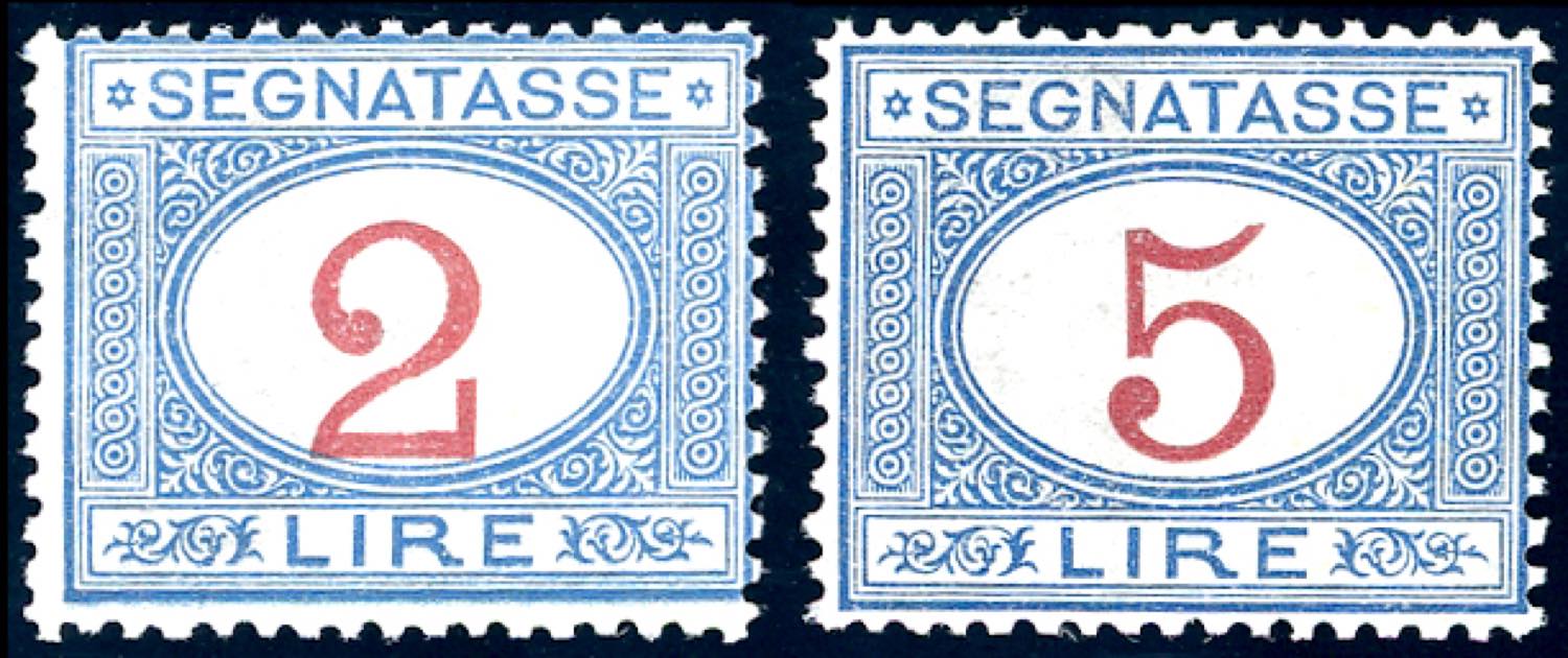 1903 - 2 lire e 5 lire azzurro e carminio (29/30), gomma originale integra, perfetti. Ferrario.
