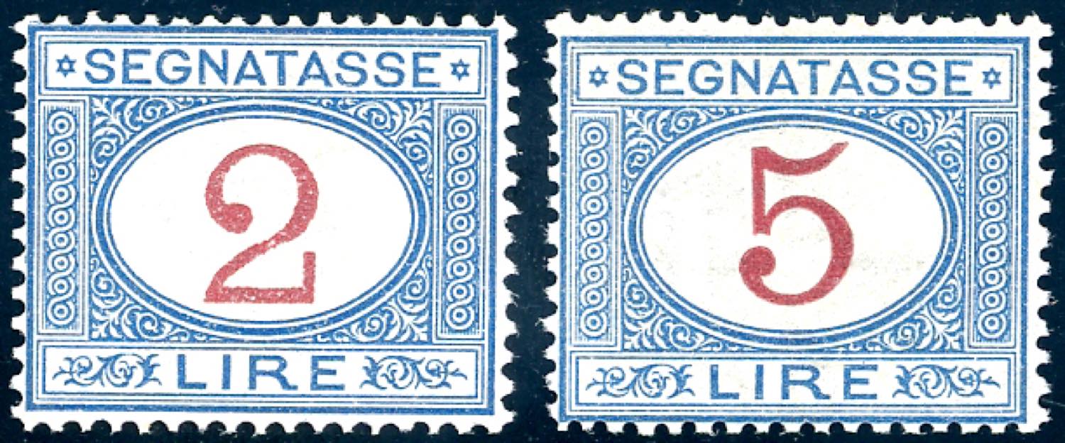 1903 - 2 lire e 5 lire azzurro e carminio (29/30), nuovi, gomma originale integra, perfetti. Molto freschi e ben centrati.