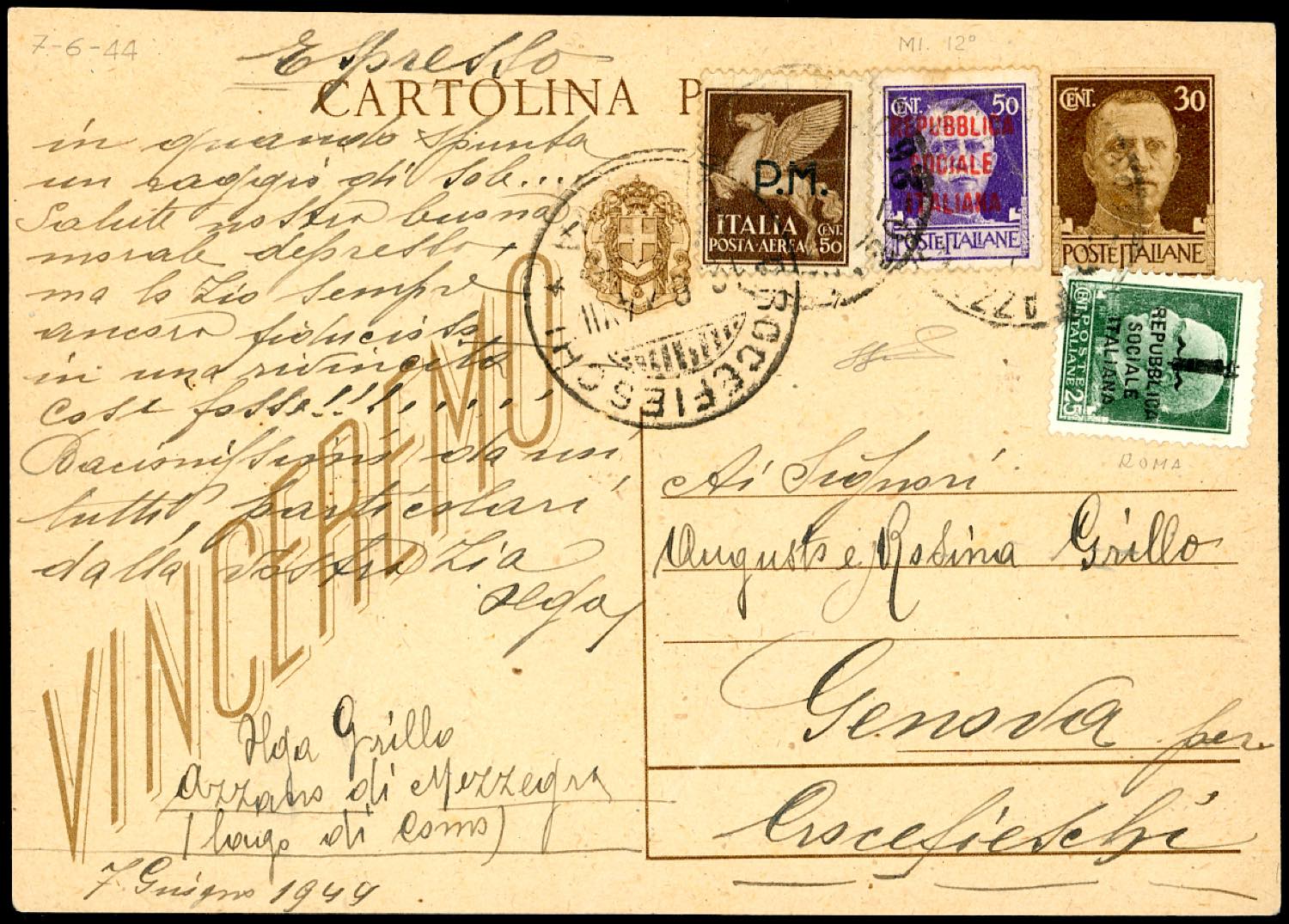 1944 - 50 cent. aerea soprastampato PM, 25 e 50 cent. soprastampati Repubblica Sociale Italiana (14,491,493), ad integrazione di cartolina postale da 30 cent., buono stato, da Azzano di Mezzegra 7/6/1944 a Crocefieschi. Rarissimo uso dei soprastampati PM nel Nord Italia in periodo di RSI. Cert. Ferrario.