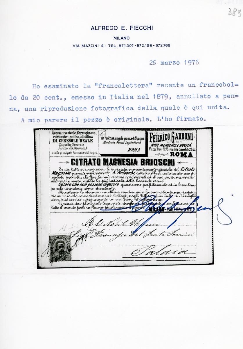 1892 - 20 cent. Umberto I, non perforato (8), perfetto, applicato su Francalettera e annullato a penna da Toiano 7/10/1891 a Palaia. UNICO CASO NOTO DEI FRANCALETTERE CON ANNULLO A PENNA. Rarità! Cert. Diena e Fiecchi.