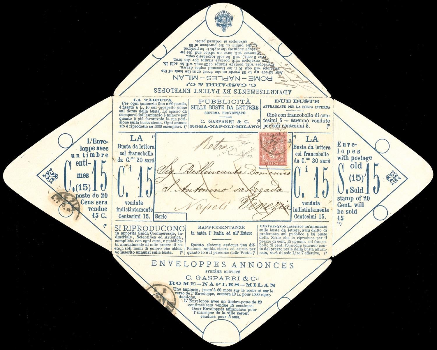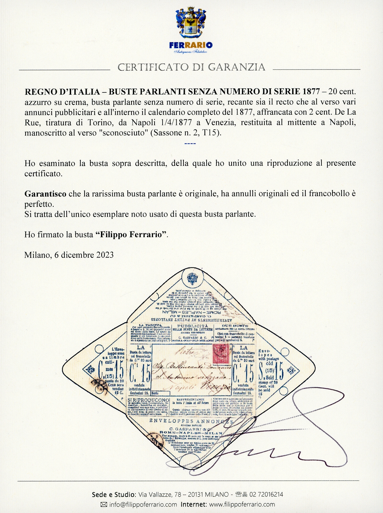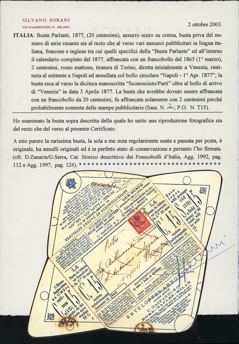 1877 - 20 cent. azzurro su crema (2), BUSTA PARLANTE SENZA NUMERO DI SERIE, recante sia il recto che al verso vari annunci pubblicitari e all'interno il calendario completo del 1877, affrancata con 2 cent. De La Rue, tiratura di Torino (T15), perfetto, da Napoli 1/4/1877 a Venezia, restituita al mittente a Napoli, manoscritto al verso "sconosciuto". Si tratta dell'UNICO ESEMPLARE NOTO USATO di questa busta parlante. Cert. Sorani, Oro Raybaudi e Ferrario.