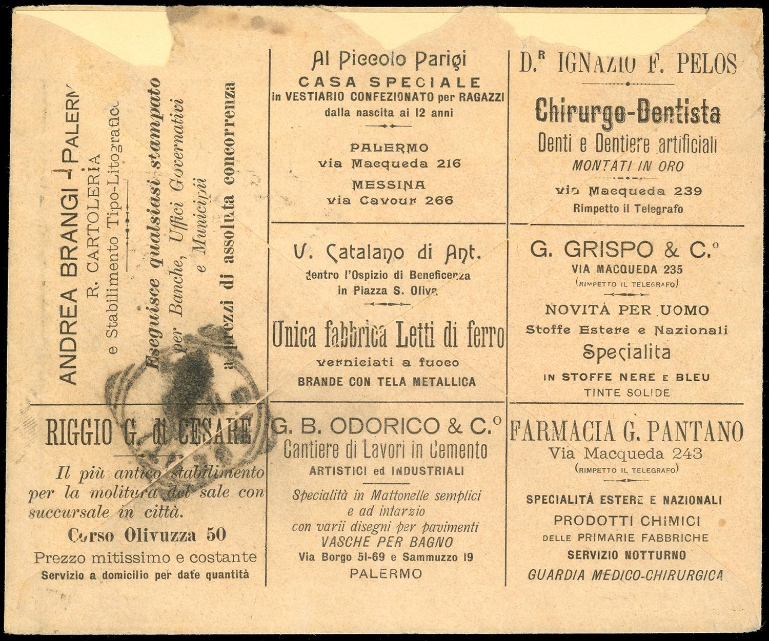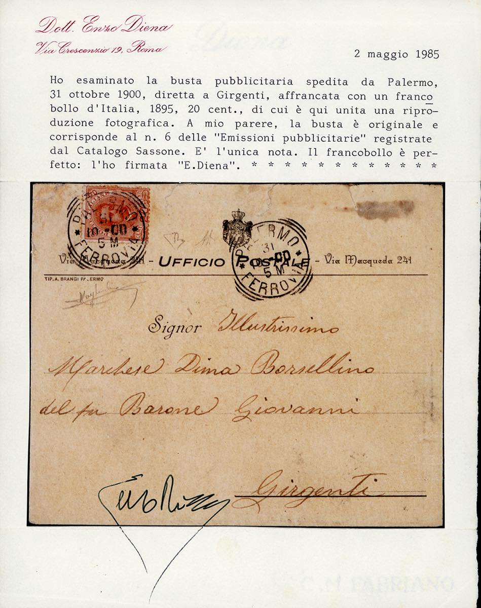 1900 - 20 cent. Umberto I, perfetto su BUSTA PARLANTE SPECIALE PUBBLICITARIA (5), edita dall'Ufficio Postale di via Macqueda, da Palermo 31/10/1900 a Girgenti. UNICA NOTA e citata dal cat. Sassone. Grande rarità del Regno d'Italia. A.Diena, cert. Enzo Diena, Raybaudi e Ferrario.