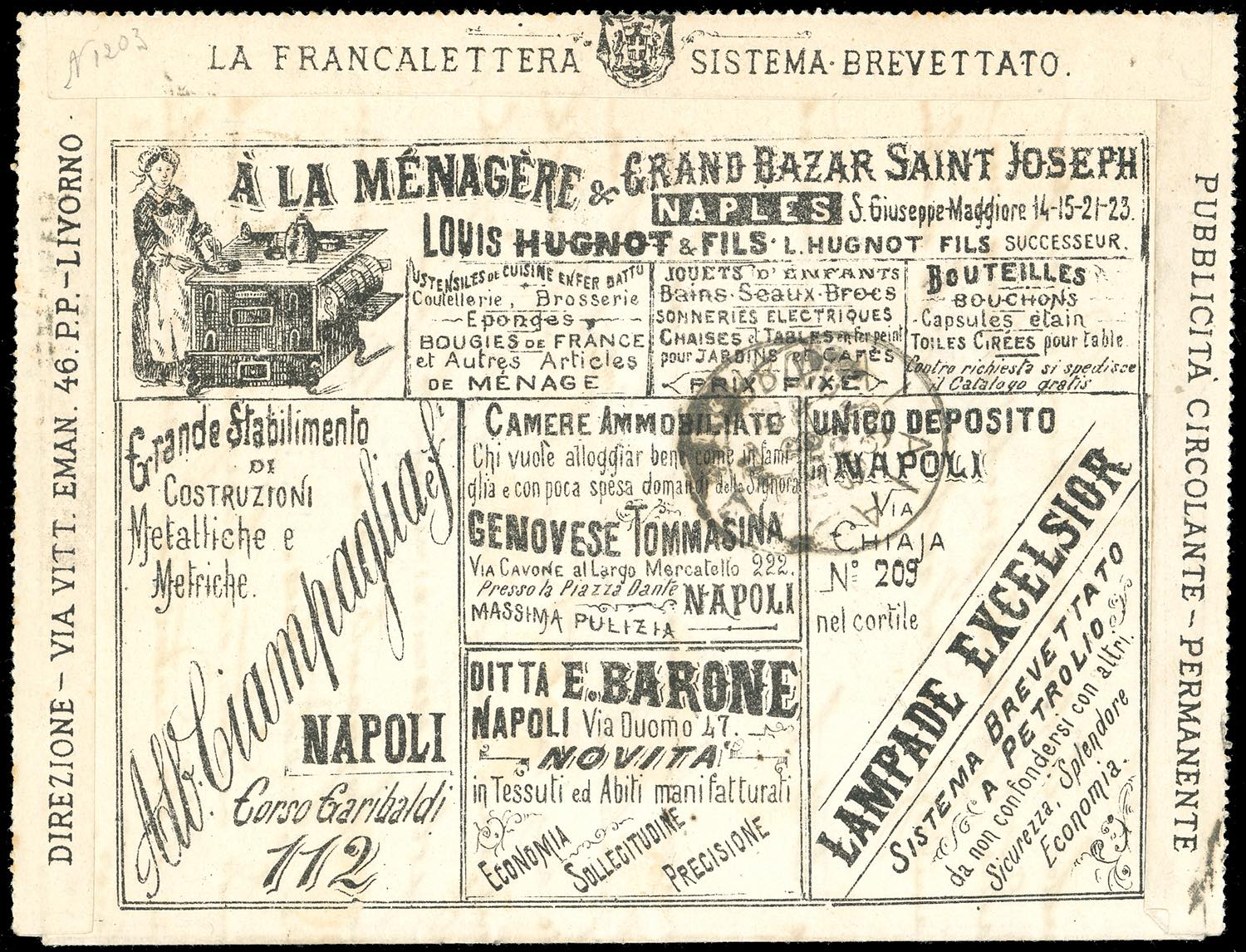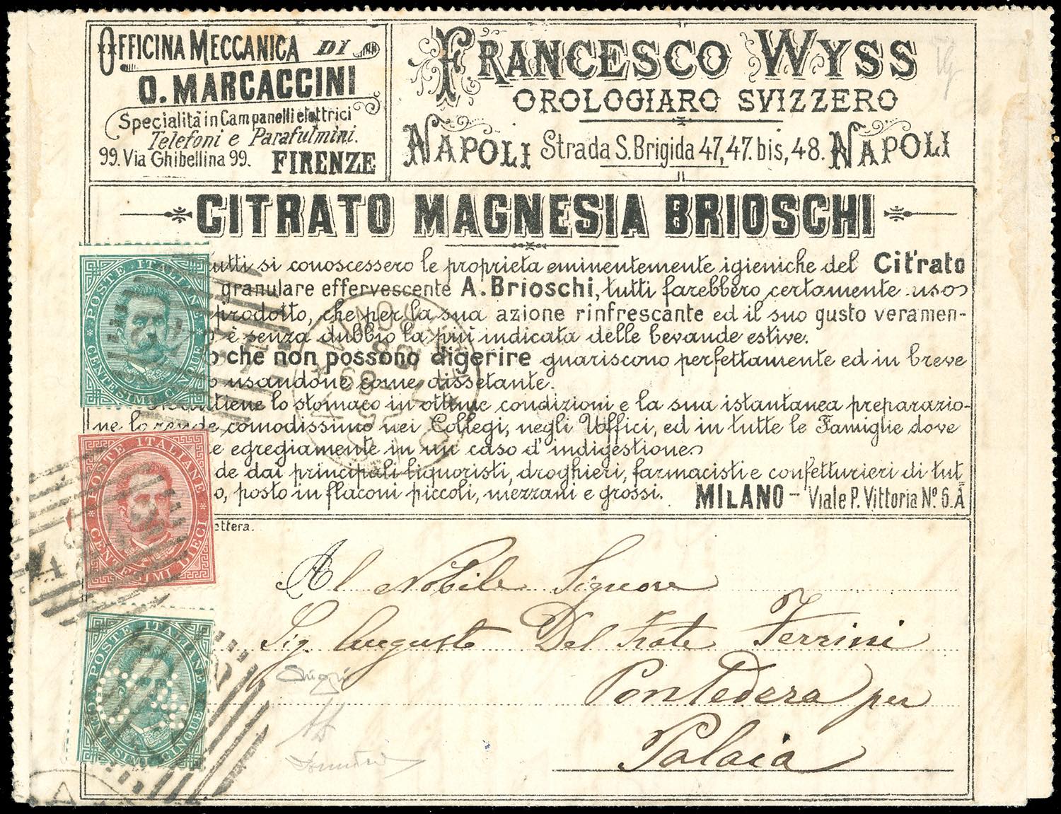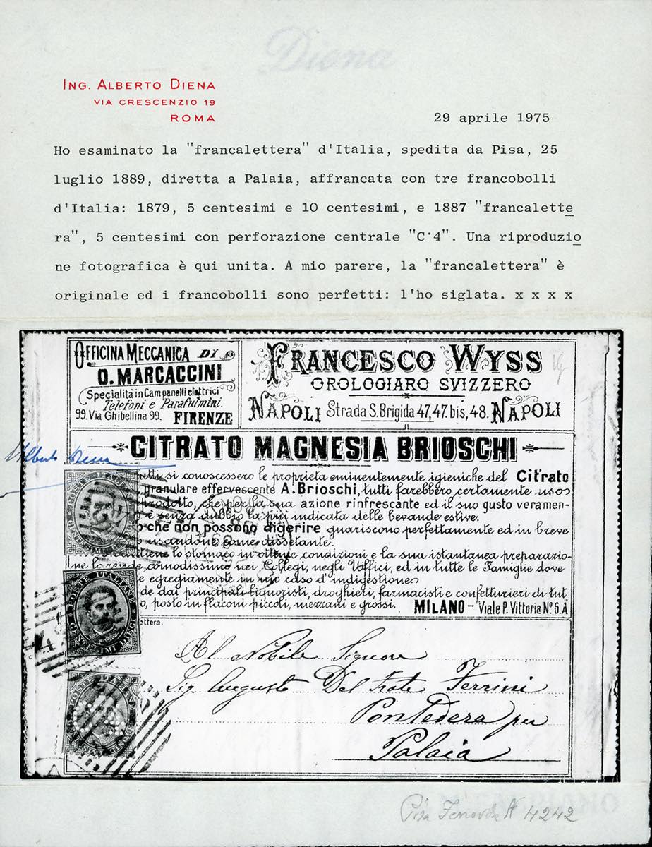1887 - 4 cent. su 5 cent. Umberto I (2), in affrancatura mista complementare con 5 cent. e 10 cent. Umberto I (37/38), perfetti, su BUSTA FRANCALETTERA da Pisa 25/7/1889 a Palaia. Rara combinazione di valori gemelli, ottima qualità. Cert. Oro Raybaudi, A.Diena e Donnini.