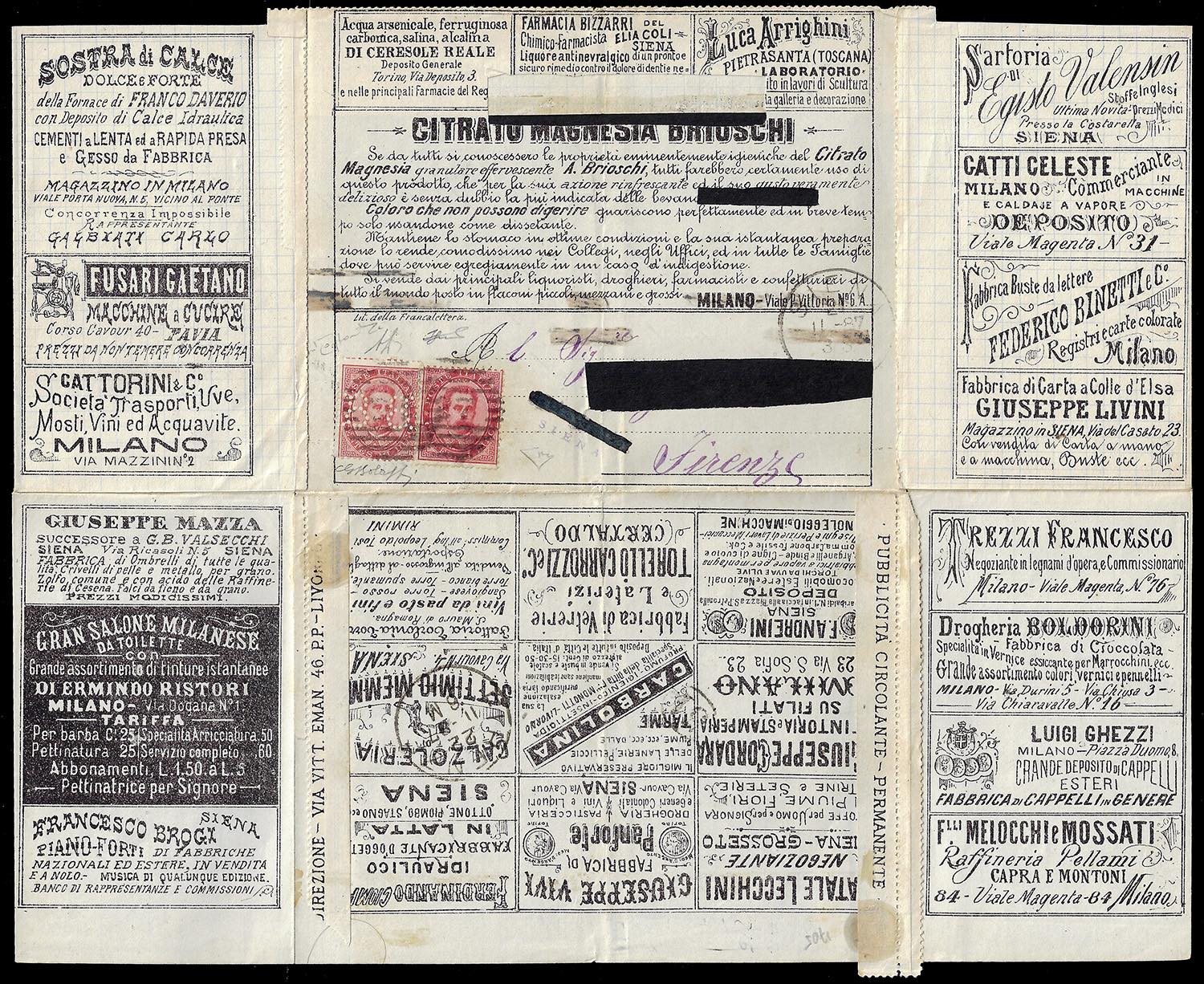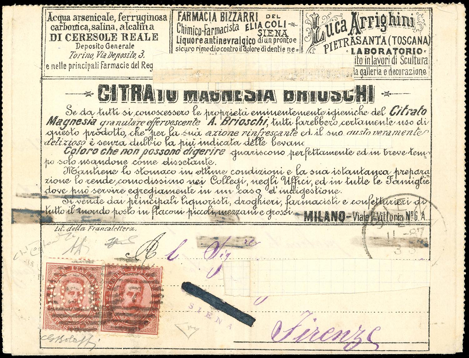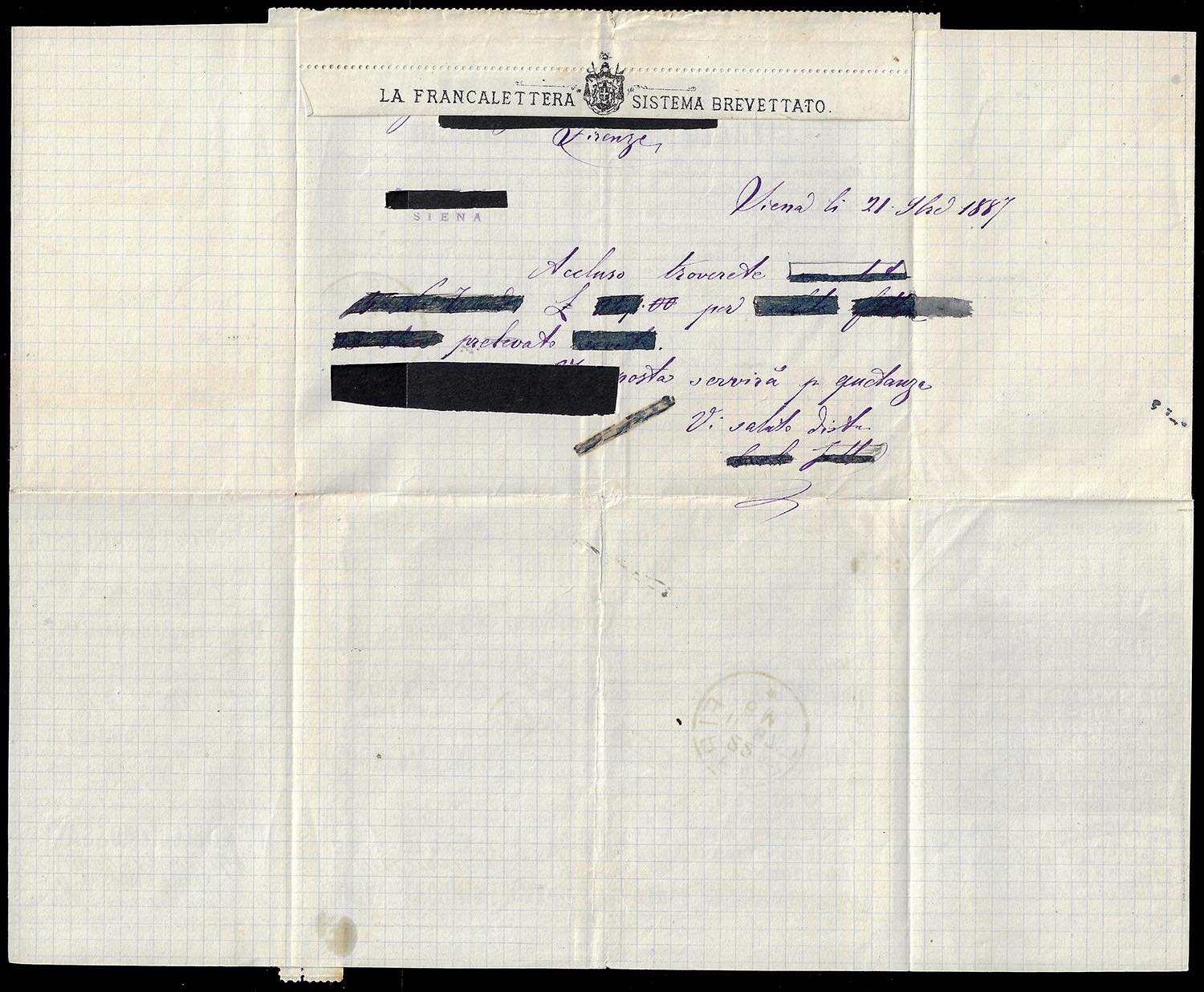 1887 - 8-8 su 10 cent. Umberto I (3), in affrancatura mista complementare con 10 cent. Umberto I (38), perfetti, su BUSTA FRANCALETTERE da Siena 2/11/1877 a Firenze. Rarissima affranctura di valori gemelli. G.Bolaffi, cert. Alberto ed Enzo Diena e Oro Raybaudi.