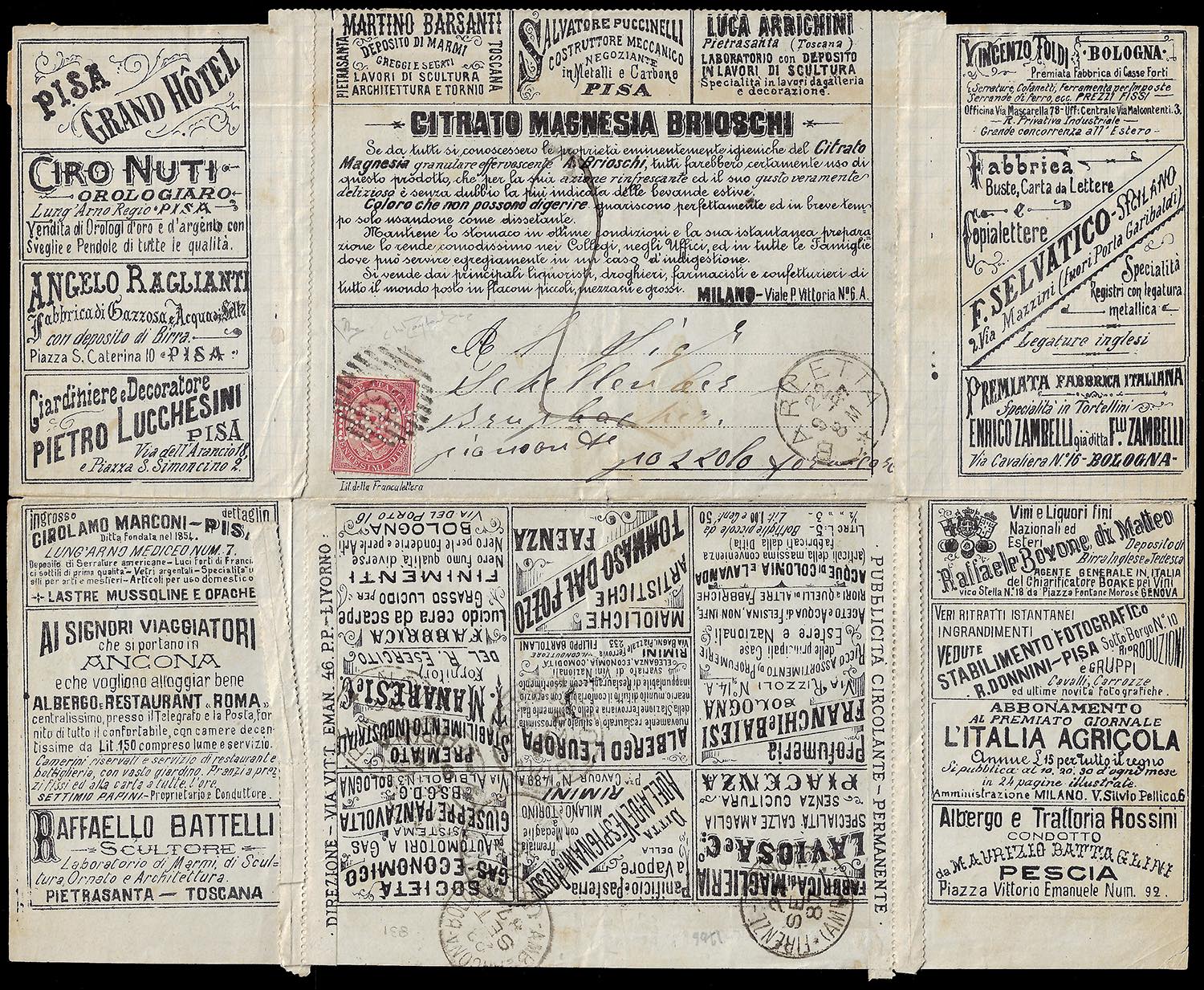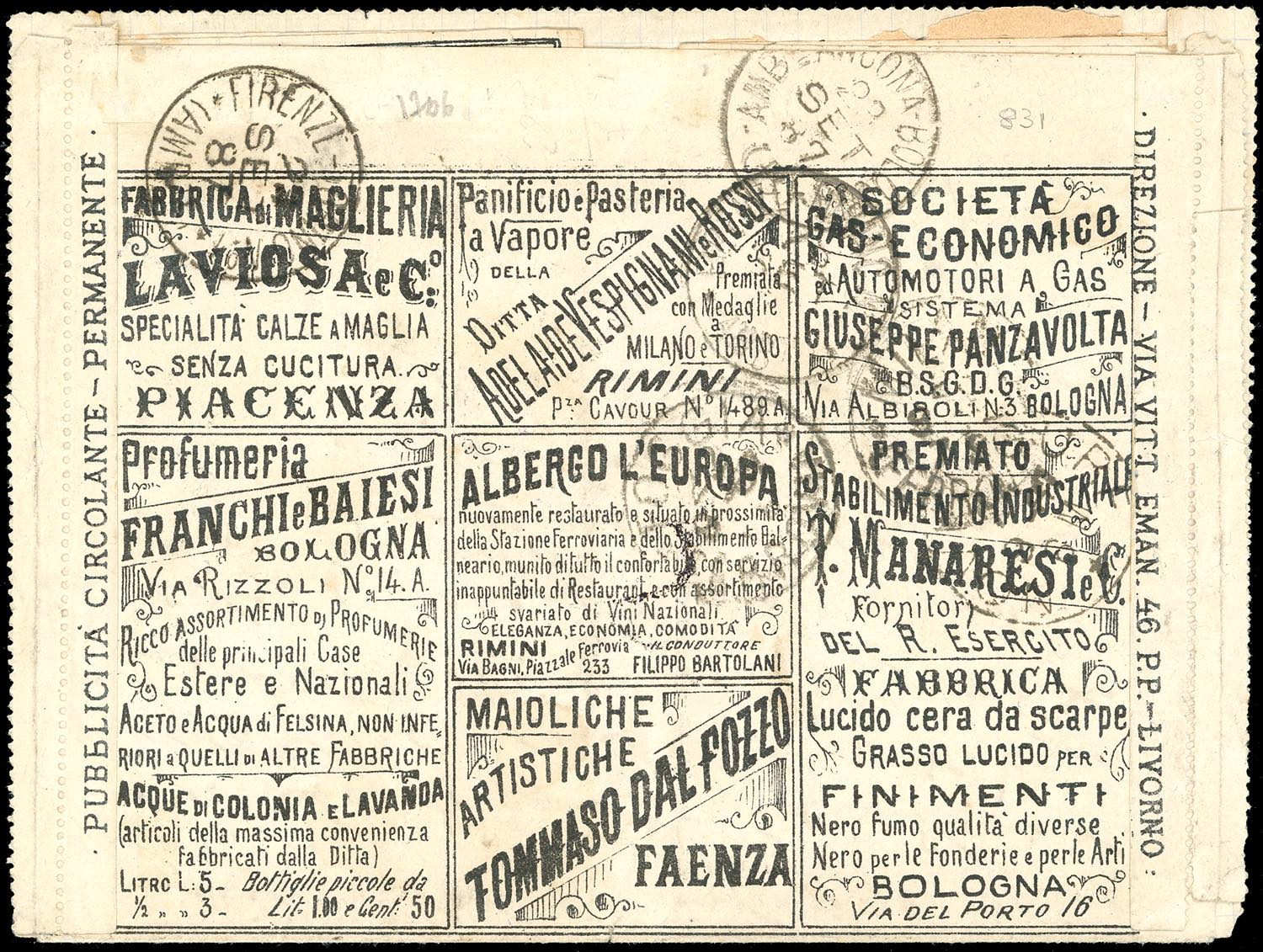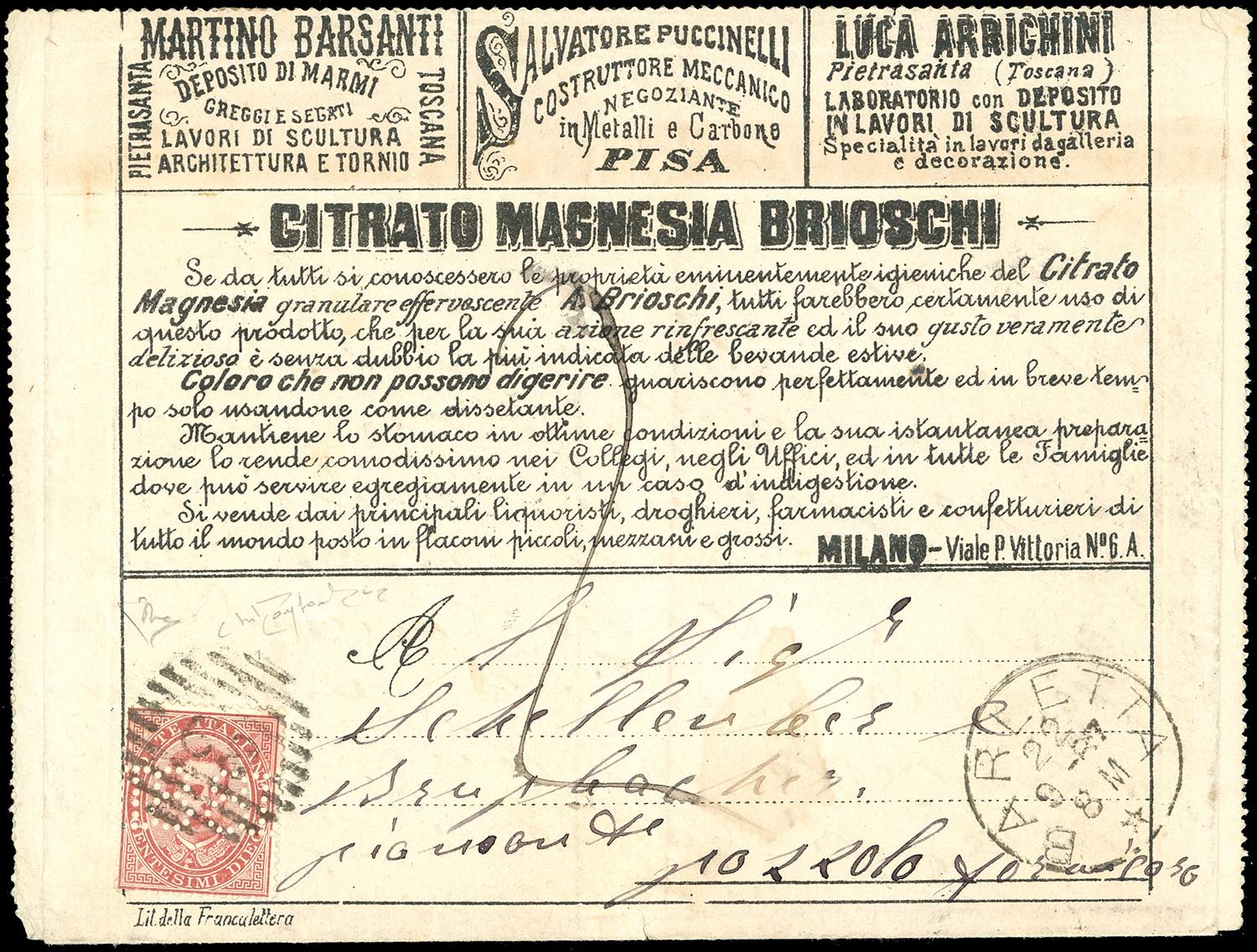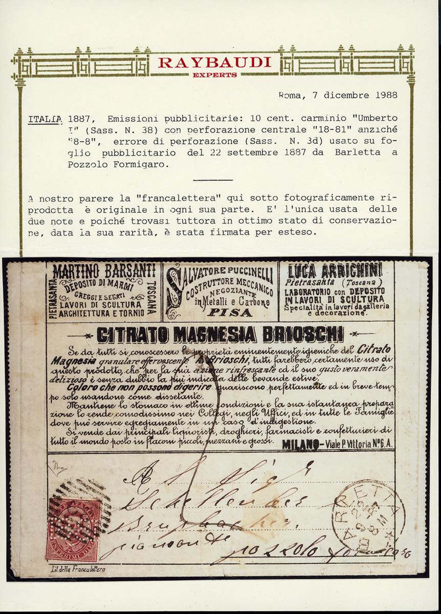 1887 - 10 cent. Umberto I con perforazione centrale "18-81" (3d), su busta francalettere da Barletta 22/9/1887 a Pozzolo Formigaro, tassata 20 cent. Il francobollo presenta i consueti tagli praticati prima dell'applicazione, che non ne diminuiscono il valore, per impedire che venisse staccato ed usato su altre corrispondenze. Enzo Diena e cert. Oro Raybaudi (che la cita come una delle due sole note).