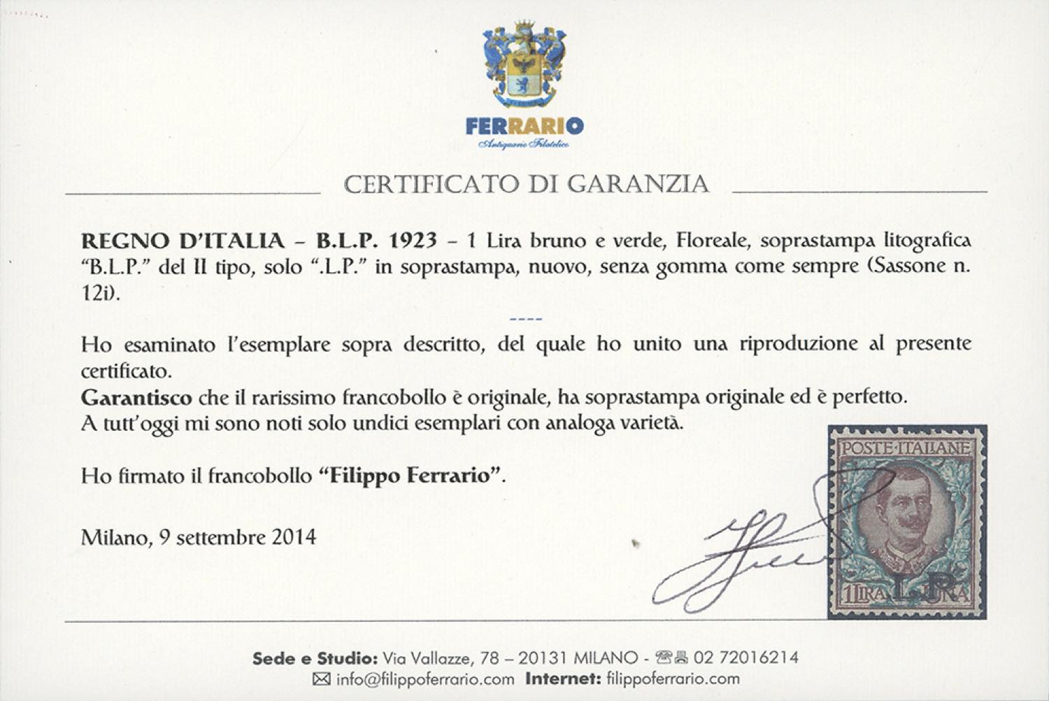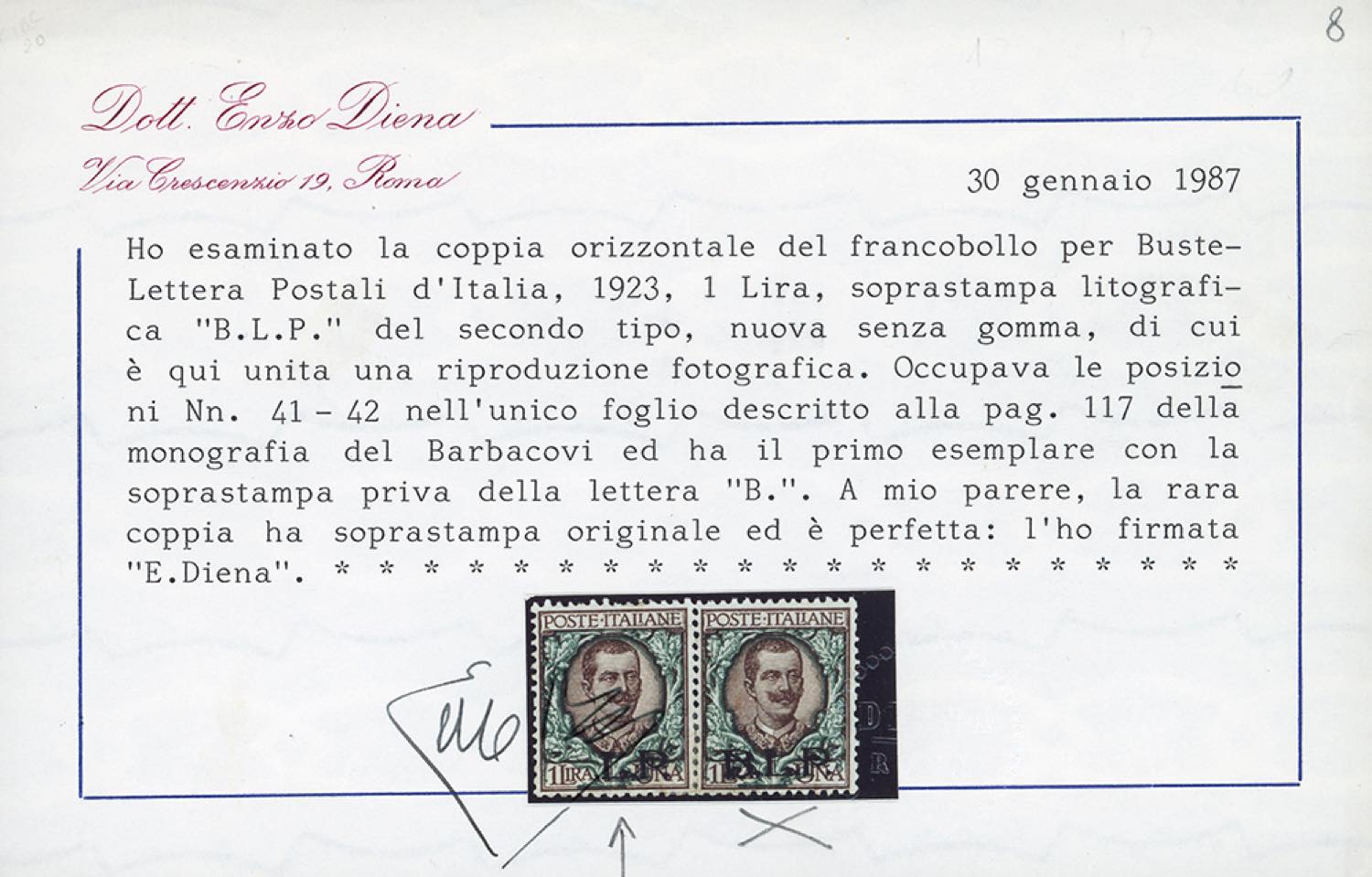 1923 - 1 lira, soprastampa BLP del II tipo, senza "B" (12i), nuovo senza gomma come sempre, perfetto. Si conoscono solo 11 esemplari di ... Leggi tutto