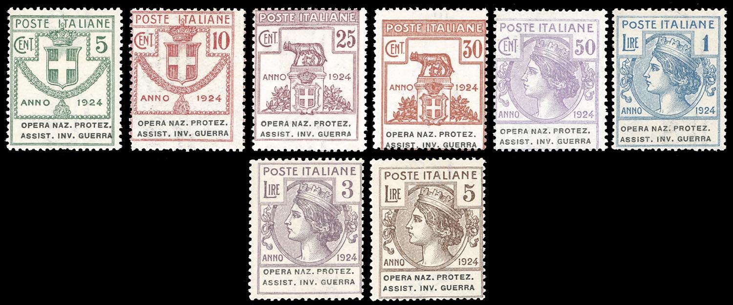 OPERA NAZ.PROTEZ.ASSIST.INV.GUERRA-ROMA 1924 - Serie completa (50/57), gomma originale integra, perfetti. Rara e di ottima qualità. ... Leggi tutto