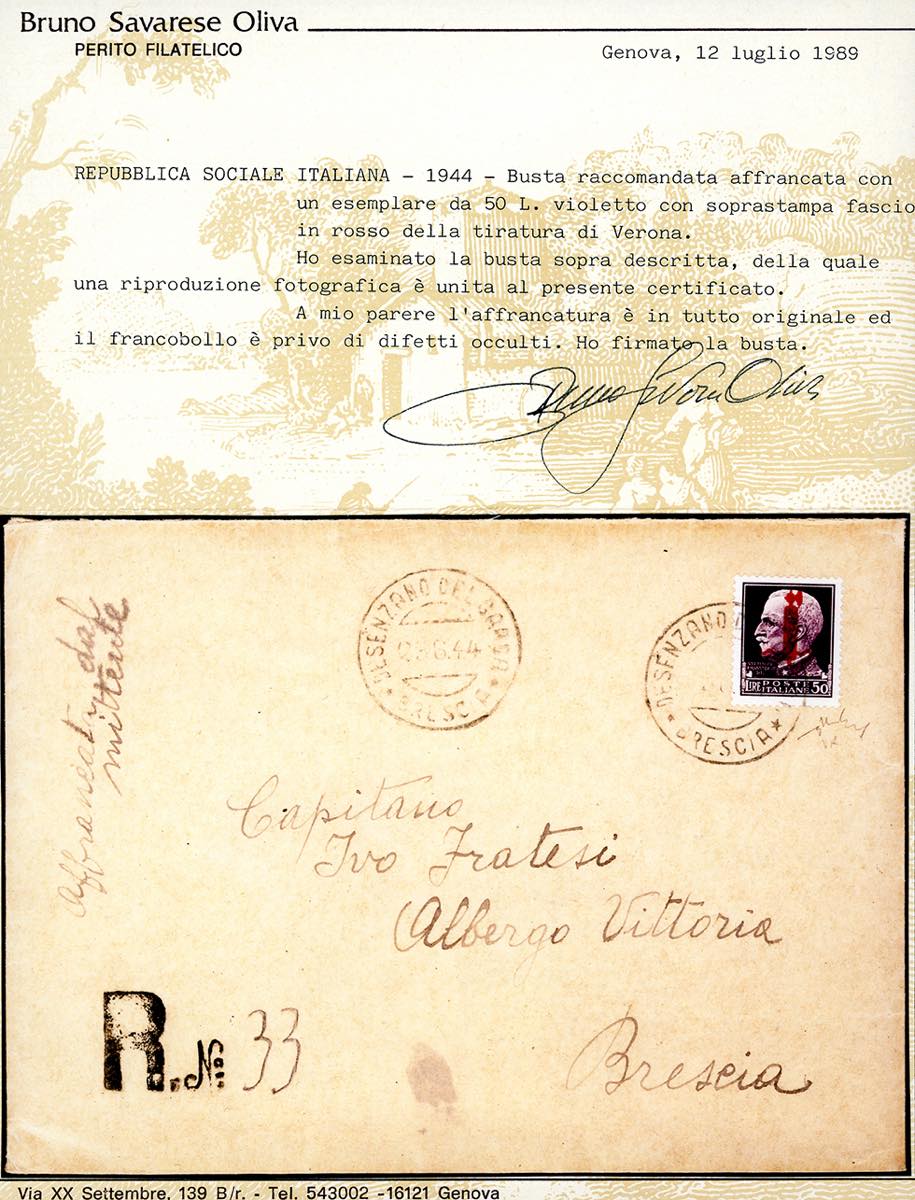1944 - 50 lire soprastampato fascio in rosso, tiratura di Verona (501), perfetto, isolato su busta raccomandata da Desenzano del Garda 28/6/1944 a Brescia, bollo di arrivo al verso. Allegato il tagliandino di ricevuta della raccomandata. Eccezionale e rarissimo uso precedente all'emissione come da Decreto Interministeriale del 29/7/1944, con l'ulteriore pregio di essere stata spedita da una località non in provincia di Verona. Rarità per specialista. Cert. Colla, Chiavarello, Savarese Oliva.