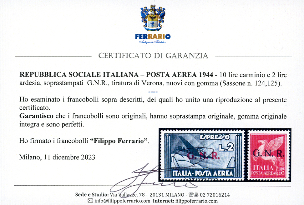 1944 - Soprastampati G.N.R., tiratura di Verona, serie completa (117/125), gomma originale integra, perfetti e di ottima qualità. Cert. Ferrario per gli alti valori.