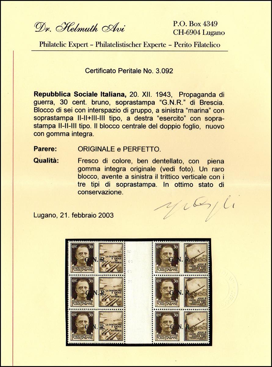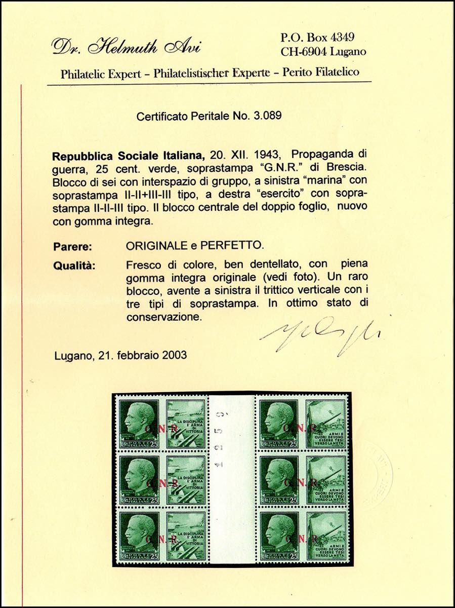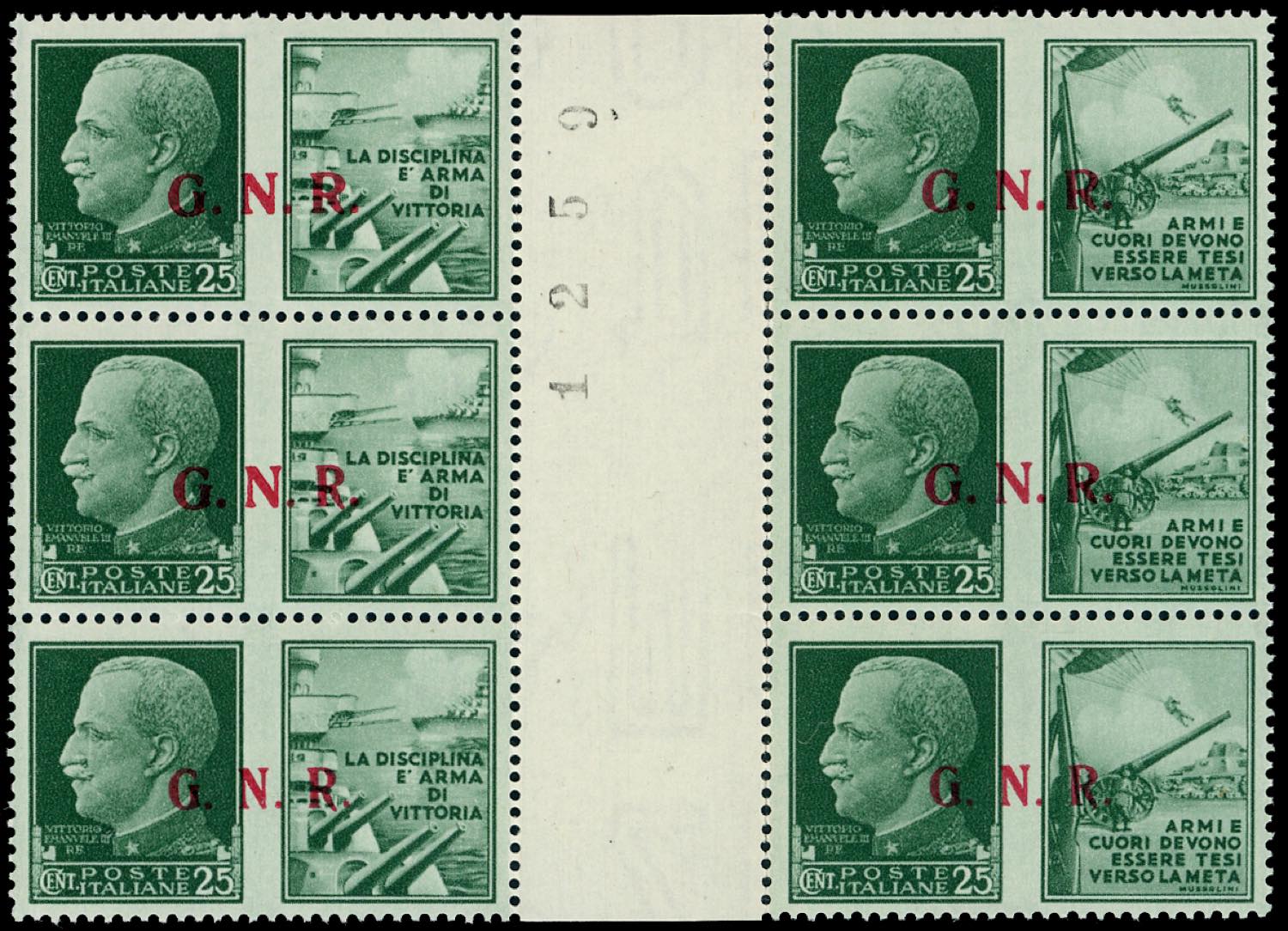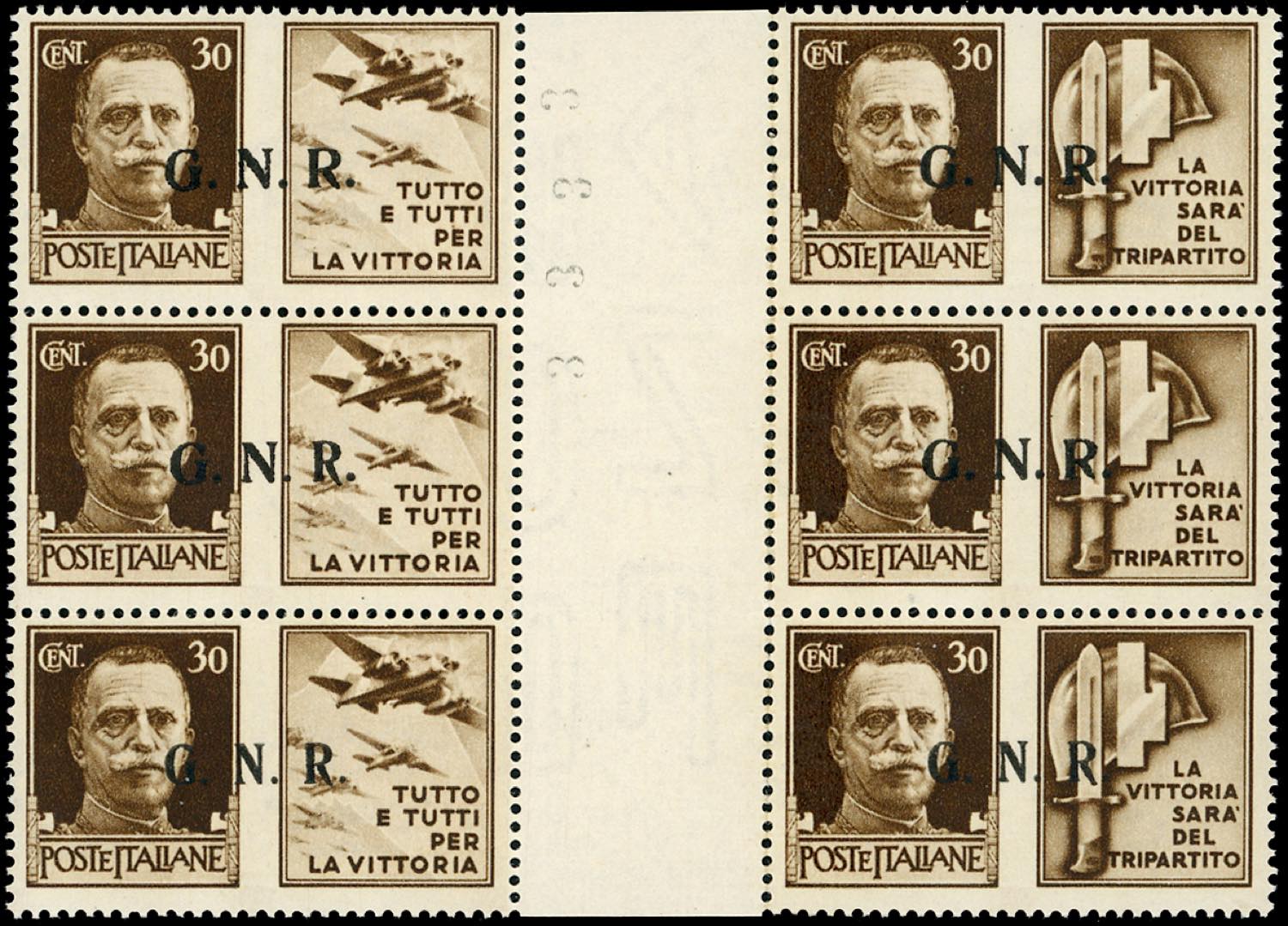 1943 - Eccezionale insieme di tutte le coppie orizzontali con interspazio di gruppo possibili della tiratura di Brescia con soprastampa G.N.R. Si tratta dei dodici valori soprastampati in blocchi di sei esemplari con interspazio di gruppo al centro. La prima coppia orizzontale ha soprastampa del II tipo, la seconda ha sul primo esemplare GN del II tipo e R del III tipo e sul secondo del II tipo, la terza coppia ha soprastampa del III tipo (13/II-24/III,13/III-24/III,13/Iia-24/II), nuovi, gomma originale integra, perfetti. Insieme splendido ed estremamente raro anche per la mancanza delle consuete pieghe verticali nell'interspazio. Ferrario, cert. Avi.