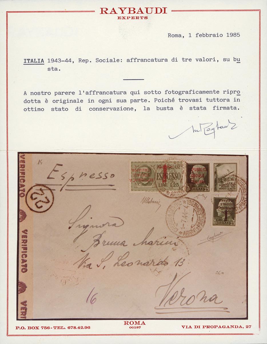 1944 - 25 cent. Esercito soprastampato "Repubblica Sociale Italiana" in rosso, scambio di soprastampa, 25 cent. e 1,25 lire espresso, entrambi con soprastampa capovolta (26B,491a,E21ab), perfetti, su busta espresso da Cremona 1/7/1944 a Verona, verificata per censura. Eccezionale uso su busta del francobollo di propaganda di guerra con scambio di soprastampa, probabilmente unico. Rarità per specialista. Chiavarello, cert. Raybaudi.