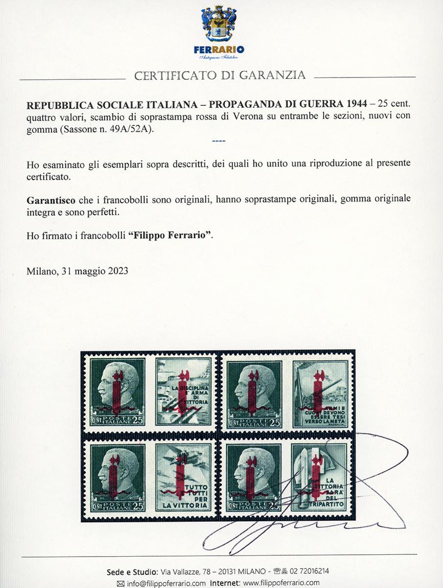 1944 - 25 cent. quattro valori scambio di soprastampa rossa di Verona su entrambe le sezioni (49A/52A), nuovi, gomma originale integra, perfetti. Molto belli e pochi esistenti. Raybaudi, cert. Ferrario.