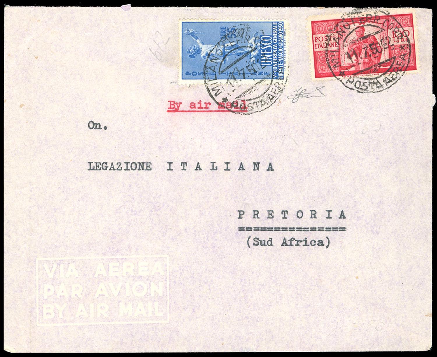 1950 - 100 lire Democratica e 55 lire Unesco (565,619), perfetti, con aerogramma da Milano 11/7/1950 per Pretoria in Sudafrica. Bella ... Leggi tutto