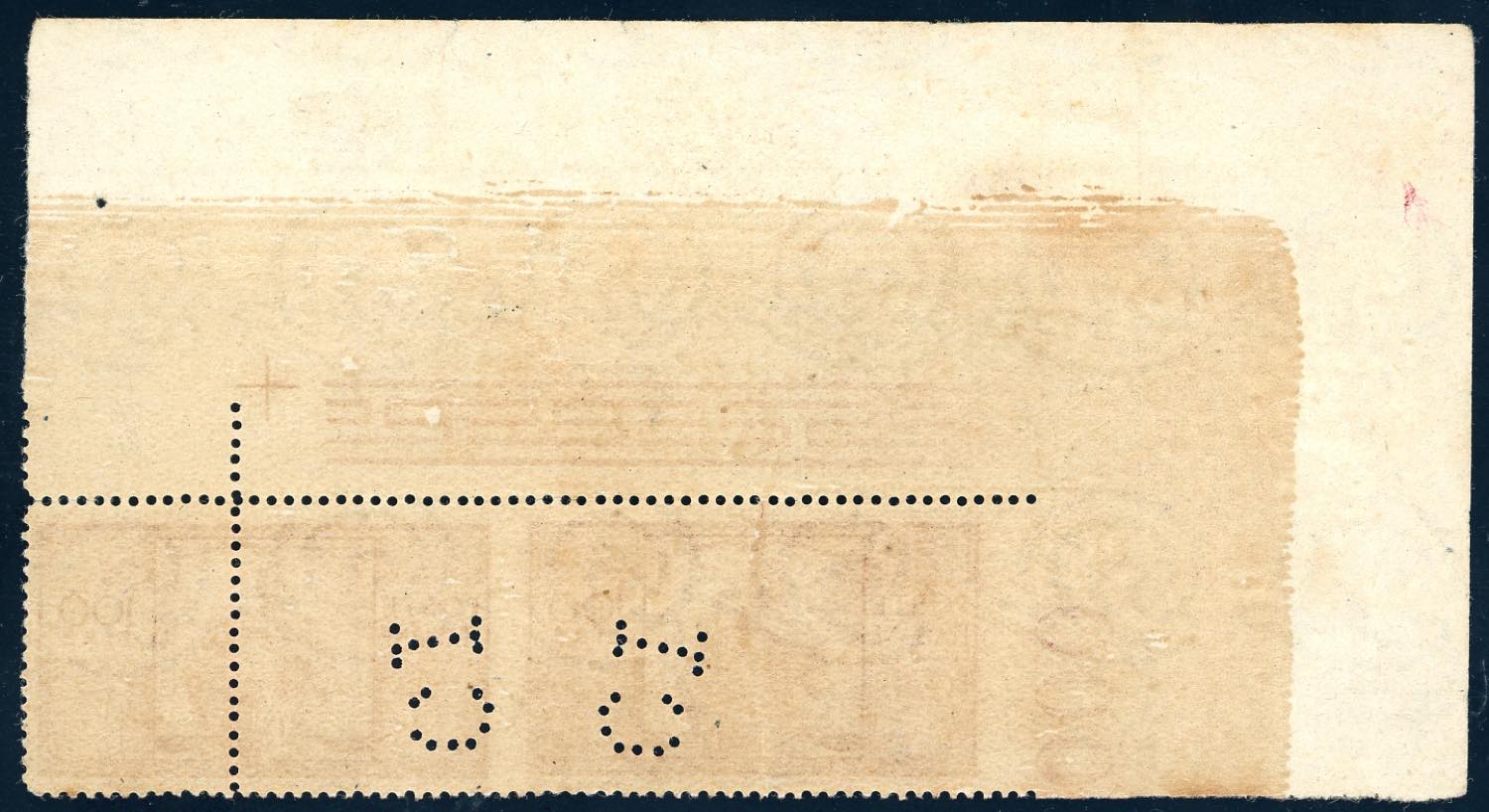 1946 - 100 lire carminio vivo Democratica, coppia orizzontale non dentellata a sinistra e con la dentellatura centrale fortemente spostata a destra (565asc), perfin Credito Italiano, angolo di foglio, gomma originale integra, perfetta. Insieme molto raro. Cert. Ferrario.