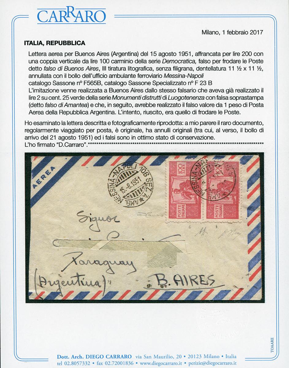 1951 - 100 lire Democratica, FALSO PER POSTA DI BUENOS AIRES, III tiratura (F565B), coppia, su aerogramma dall'ambulante ferroviario Messina-Napoli 15/8/1951 a Buenos Aires. Raro. A.Diena, G.Oliva, Ferrario, cert. Carraro.