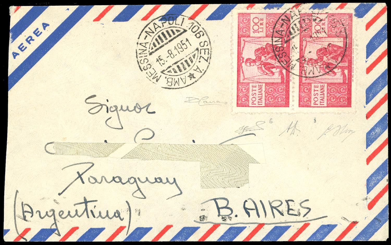 Lotto 1254 - 1951 - 100 lire Democratica, FALSO PER POSTA DI BUENOS ...