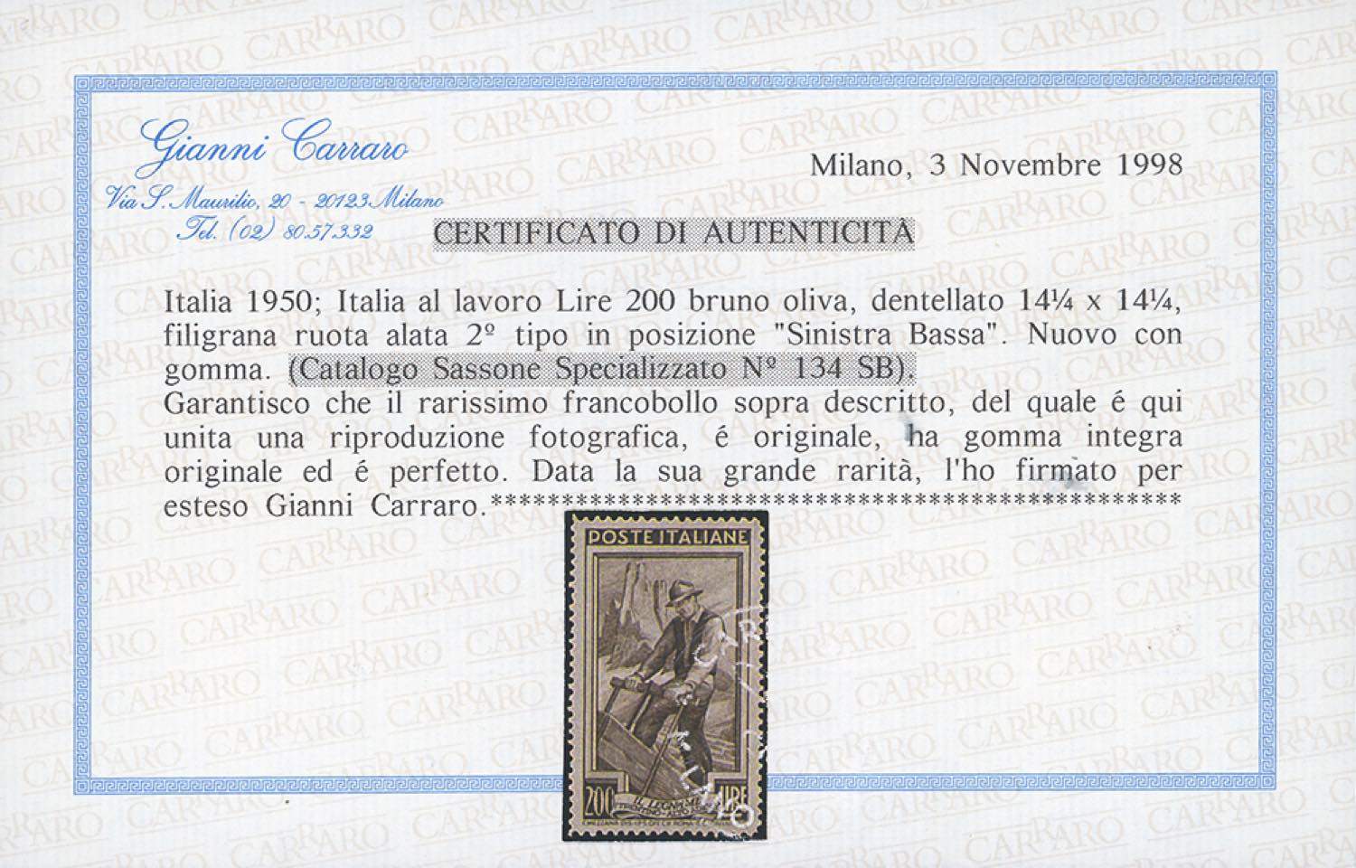 1950 - 200 lire Lavoro, dent. 14 1/4 x 14 1/4, filigrana posizione SB (652/I,Sass.Spec.134-SB), gomma originale integra, perfetto. Molto raro. Cert. Carraro.