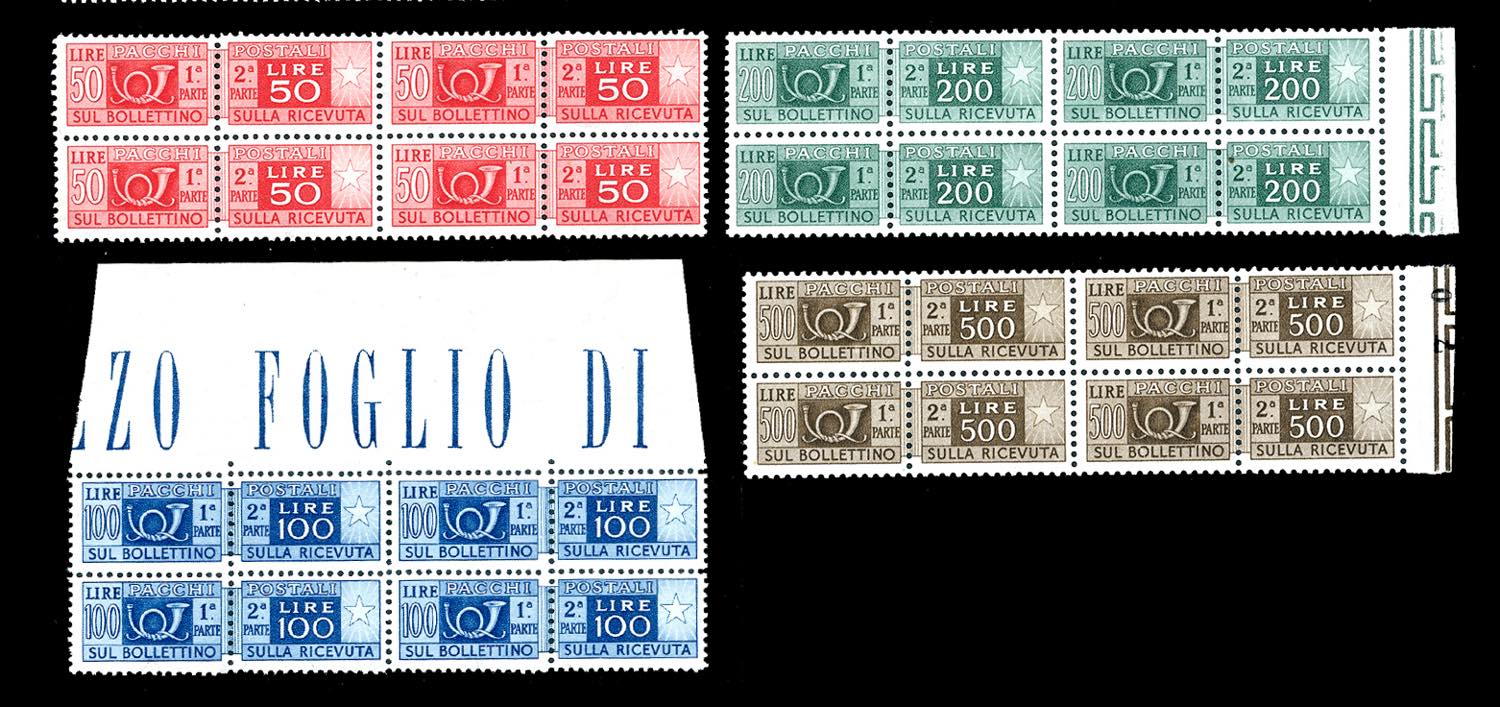 1946/51 - Filigrana ruota, serietta di 14 valori (66/78,80), bocchi di quattro, nuovi, gomma originale integra, perfetti. Centratura sopra ... Leggi tutto