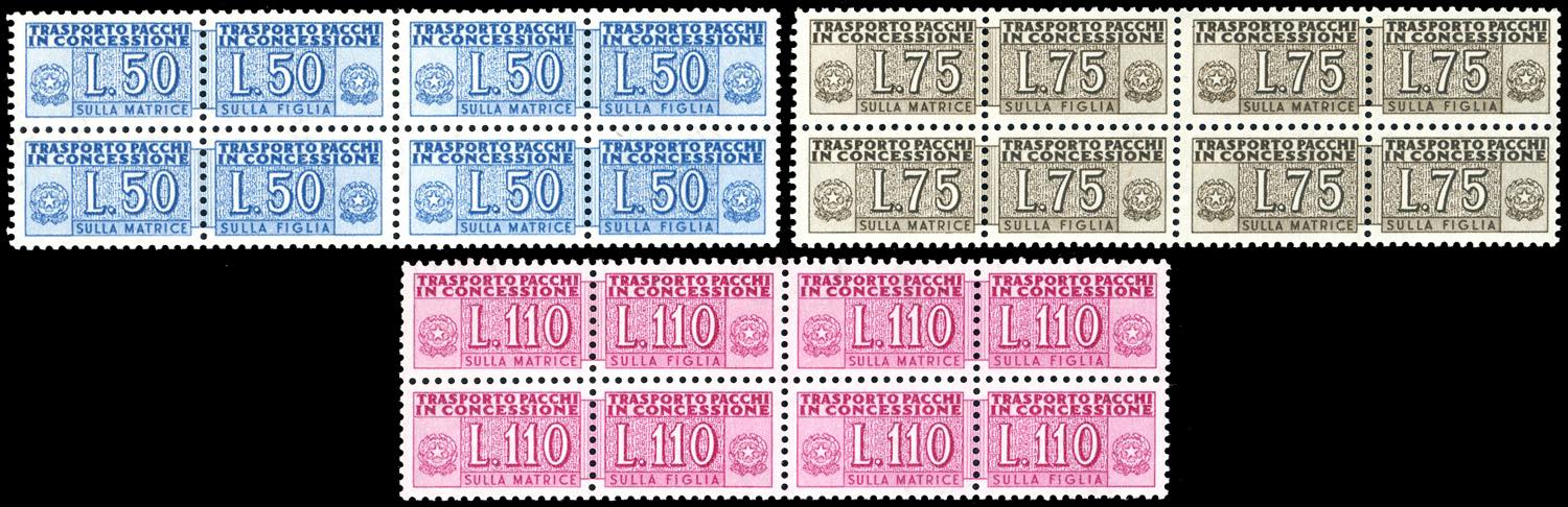 1955 - Filigrana ruota diritta, serie completa (2/I-4/I), blocchi di quattro, ottima centratura, gomma originale integra, perfetti. Molto belli. Cert. E.Diena.