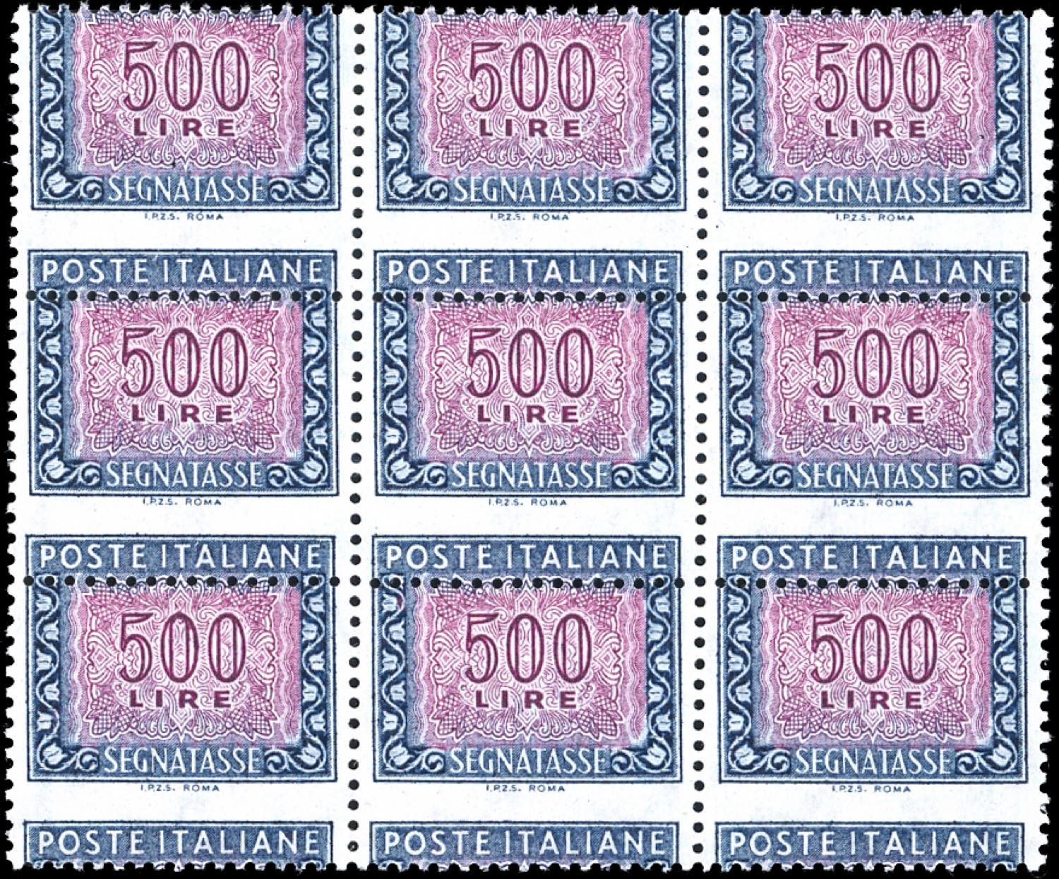 1991 - 500 lire, scritta "IPZS Roma" in basso, dentellatura orizzontale fortemente spostata in basso (123e), blocco di 9 esemplari, gomma originale integra, perfetto. Ferrario.