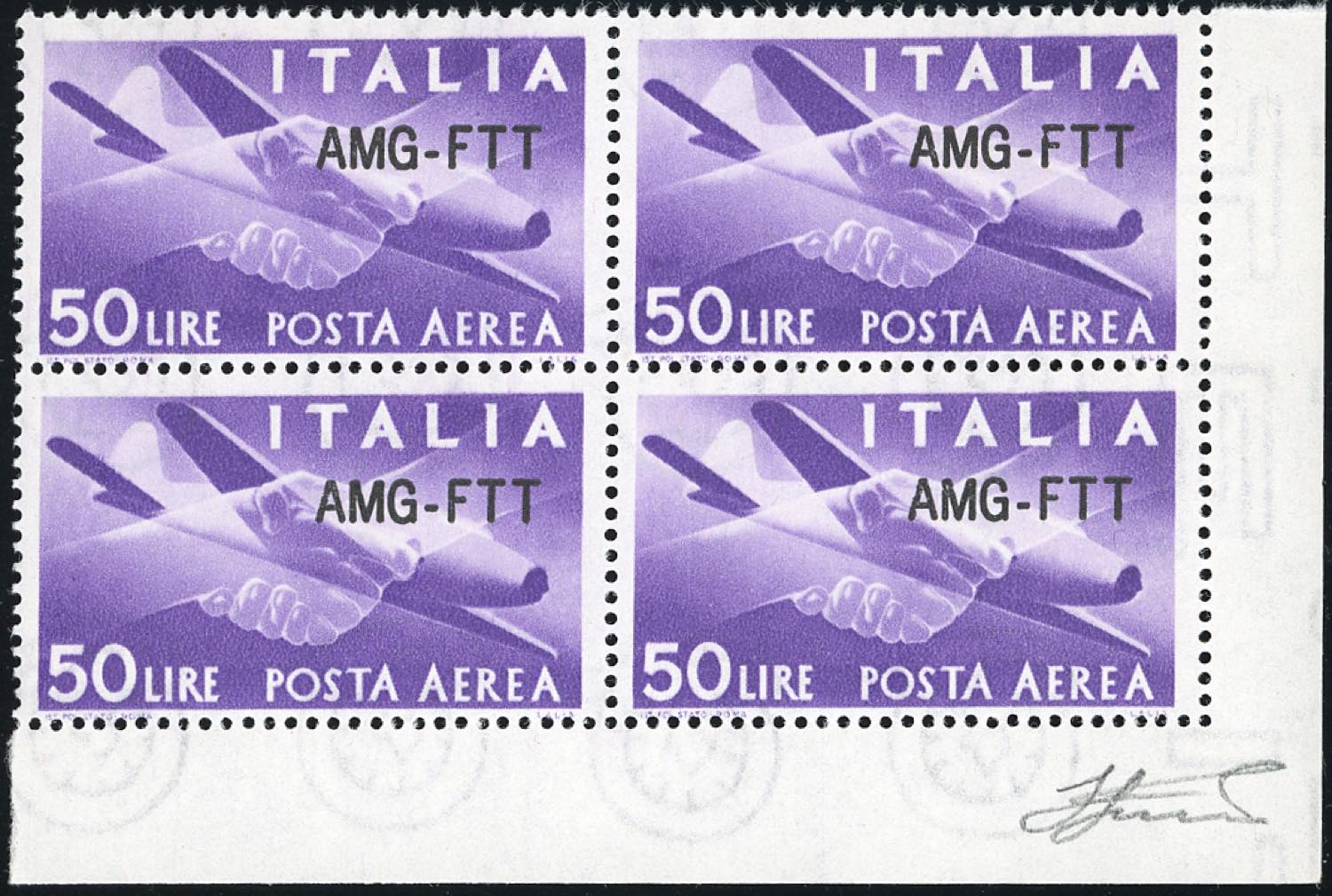 POSTA AEREA 1954 - 50 lire, nuovo tipo di soprastampa (22A), buona centratura, blocco di quattro, angolo di foglio, gomma integra, perfetto. Bello! Cert. Ferrario.