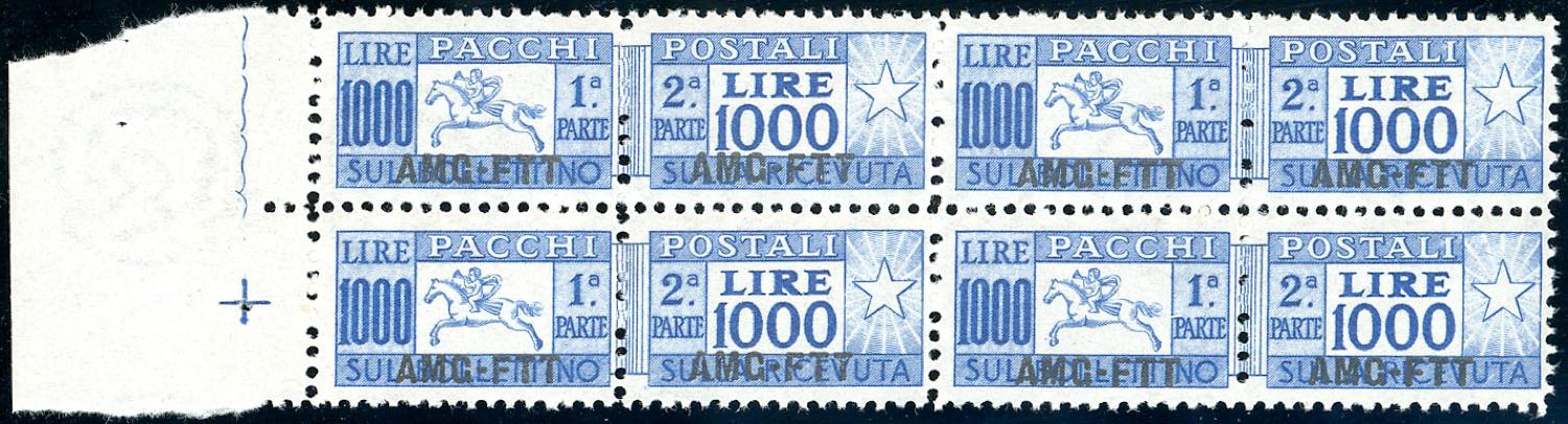 PACCHI POSTALI 1954 - 1.000 lire Cavallino soprastampato (26), ottima centratura, blocco di quattro, gomma integra, perfetto. Bello! ... Leggi tutto