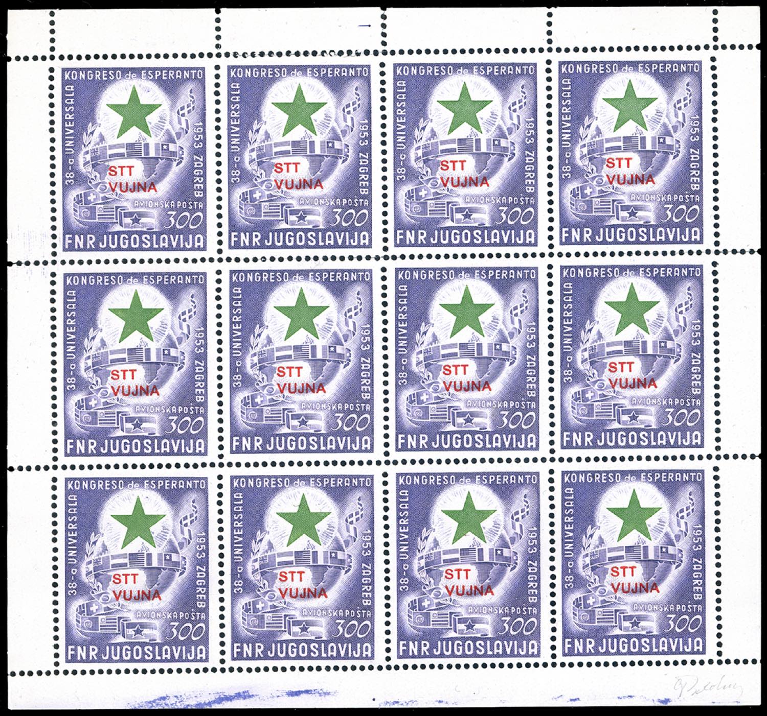 MINIFOGLI 1953 - 300 d. Esperanto, minifoglio di 12 esemplari (4), nuovo, decalco della stampa al verso, gomma originale integra, perfetto. ... Leggi tutto