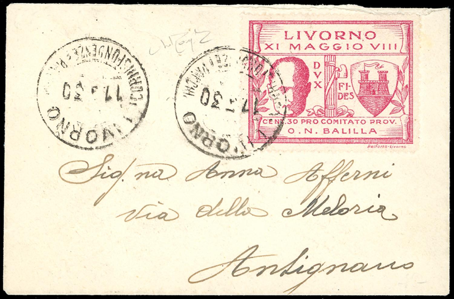 LIVORNO 1930 - 30 cent. Mussolini rosa (1), su fresca bustina da Livorno ad Antignano. Cert. Raybaudi.