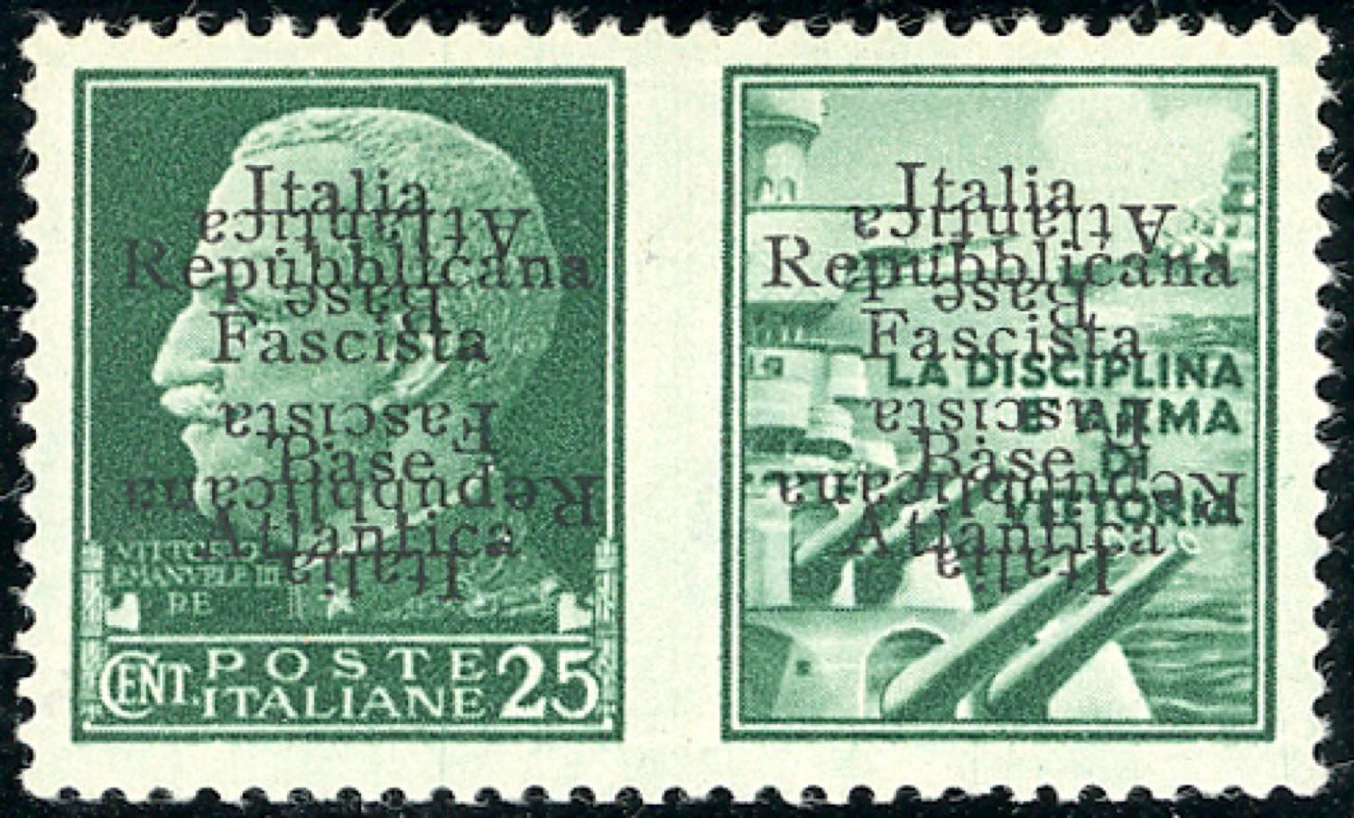 BASE ATLANTICA 1943 - 25 cent. propaganda di guerra, Marina, doppia soprastampa di cui una capovolta (12a), senza gomma, perfetto. G.Oliva, Colla. Cert. Ferrario.