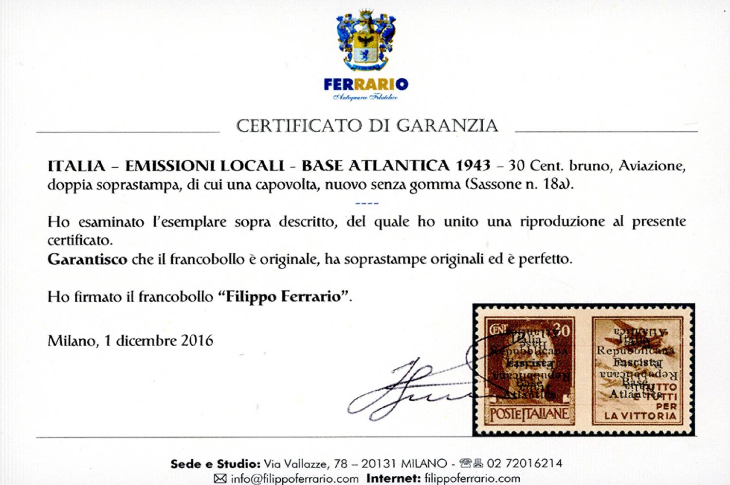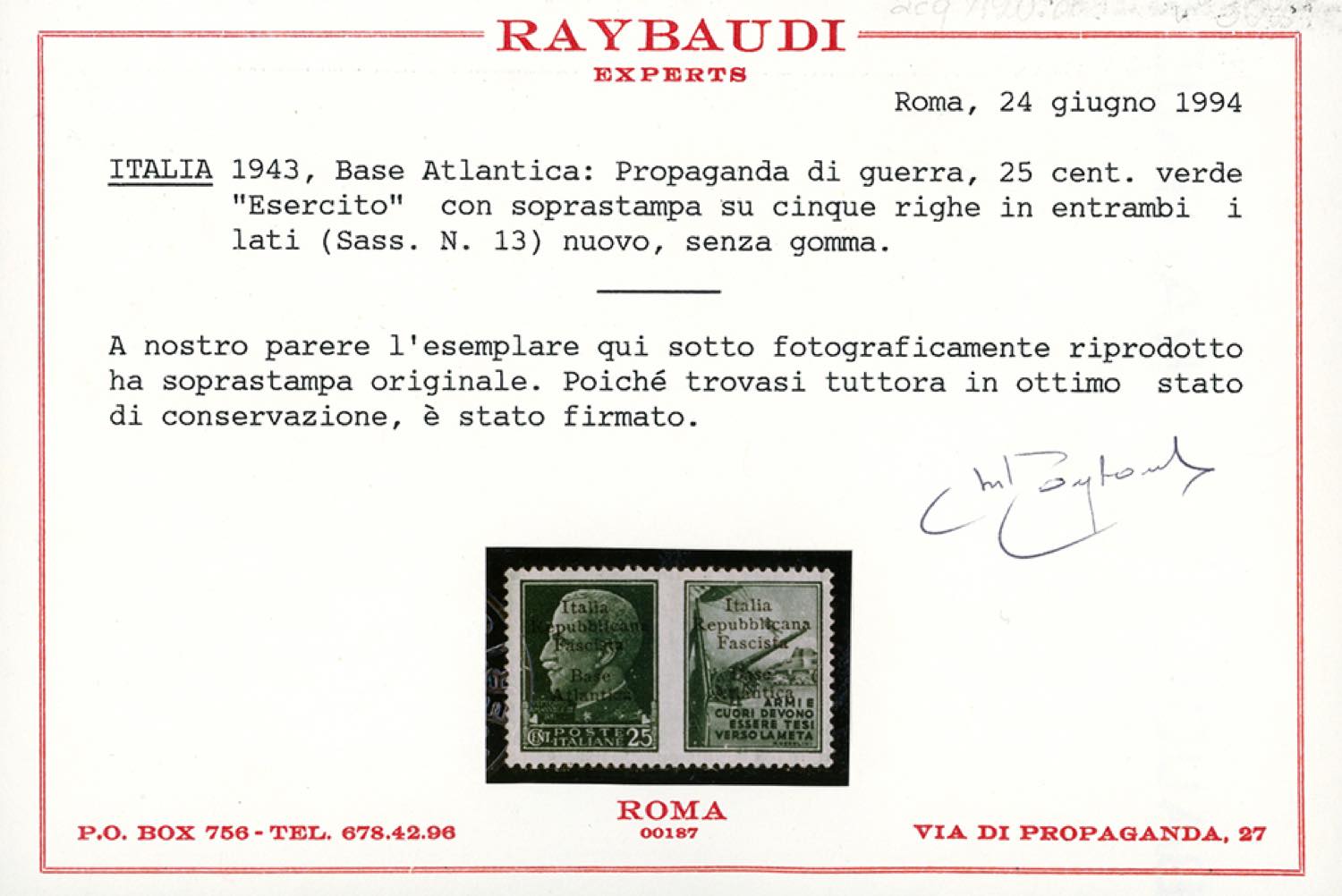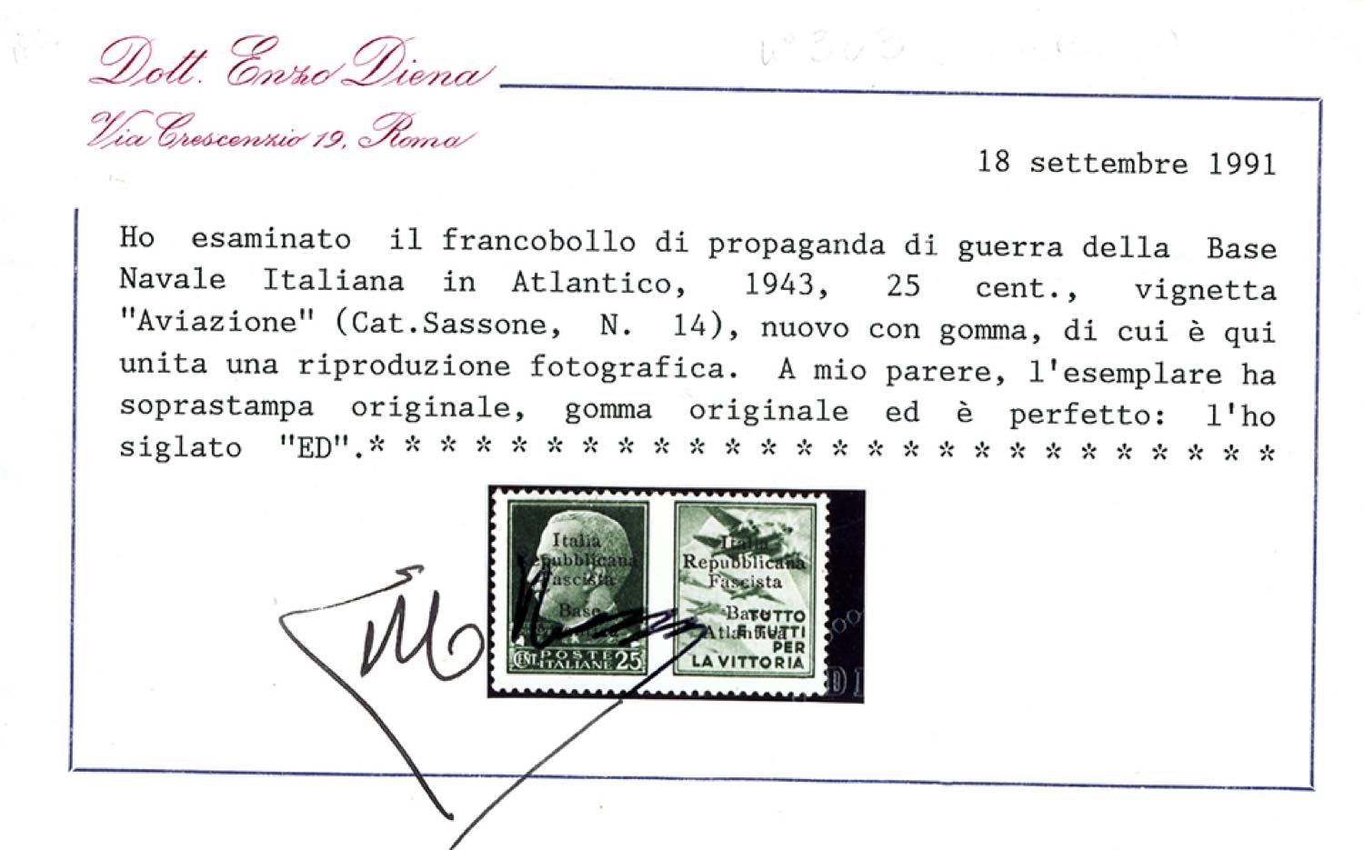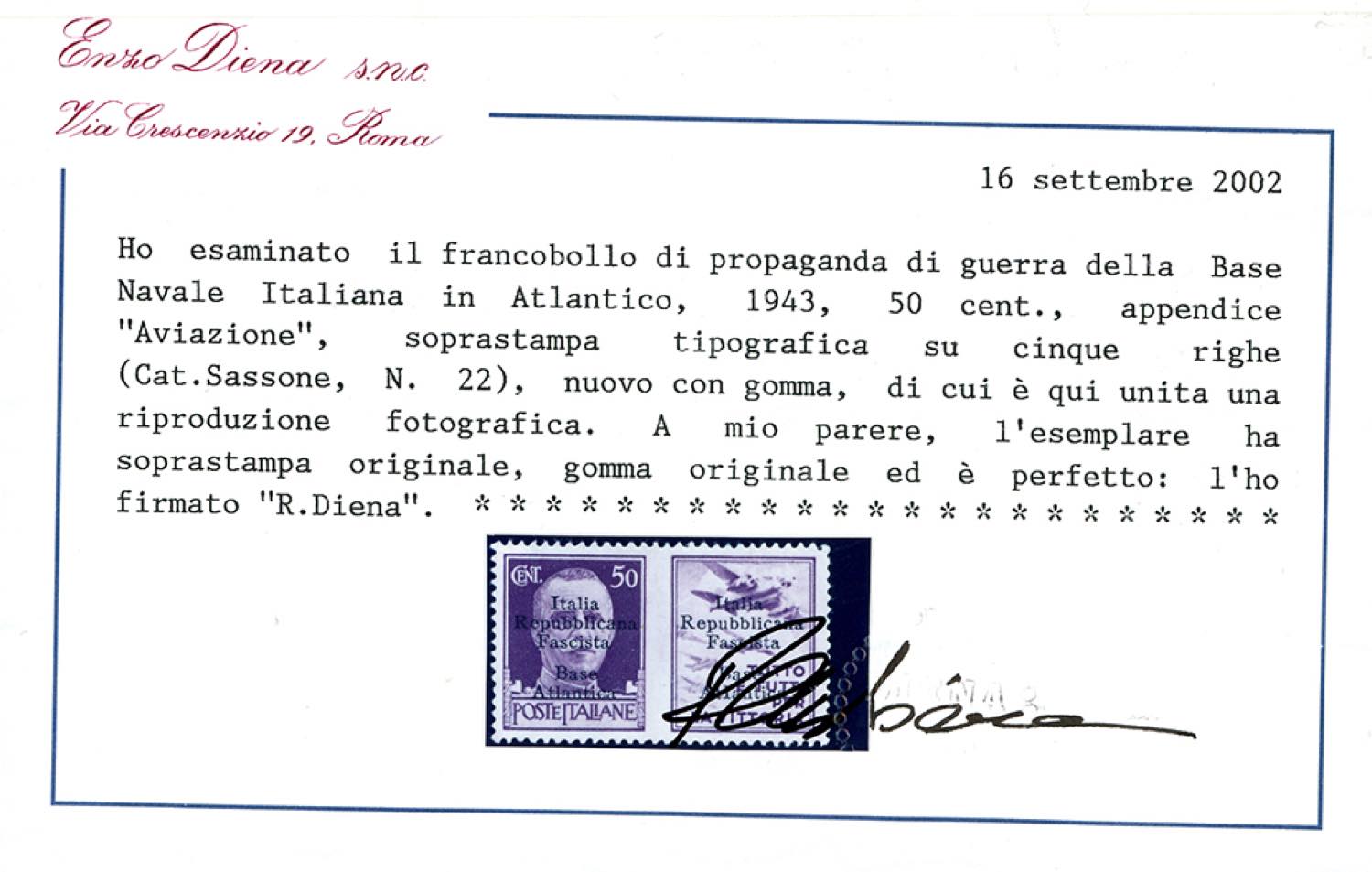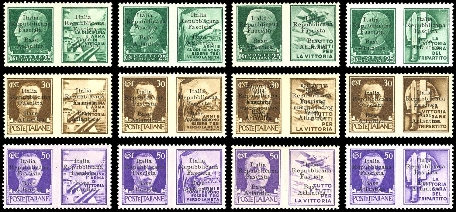 BASE ATLANTICA 1943 - Propaganda di guerra, serie completa con il 30 cent. Aeronautica con doppia soprastampa di cui una capovolta (12/17,18a,19/23), gomma originale, integra per alcuni valori, altri senza gomma, consueti lievi difetti in alcuni esemplari. Conteggio di catalogo effettuato tenendo conto dei difetti e della qualità di ogni esemplare. Insieme estremamente raro. Cert. Diena, Oliva, Raybaudi, Ferrario.