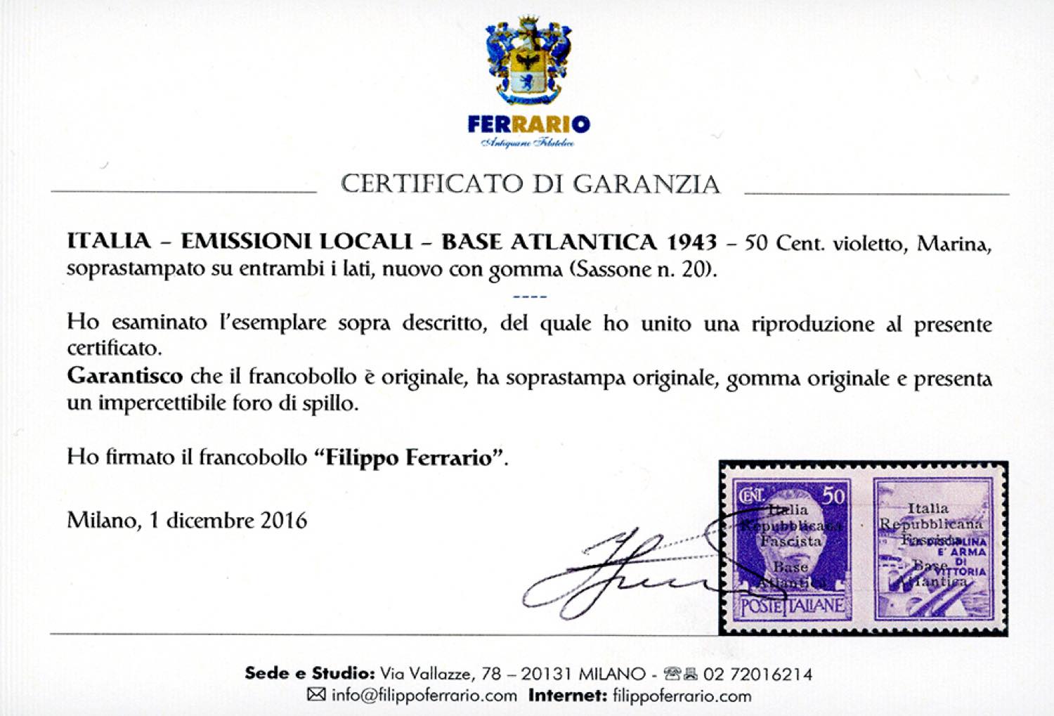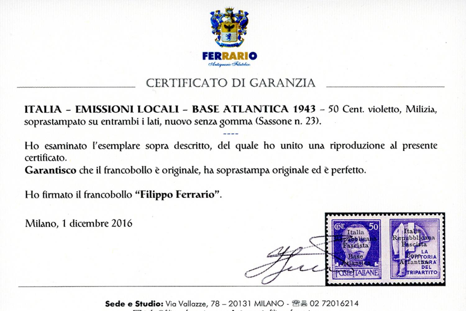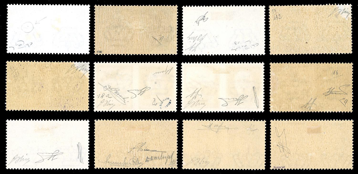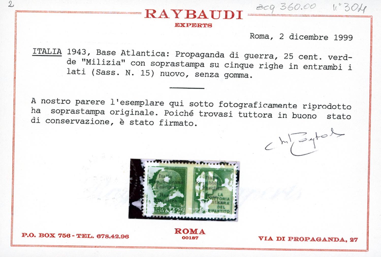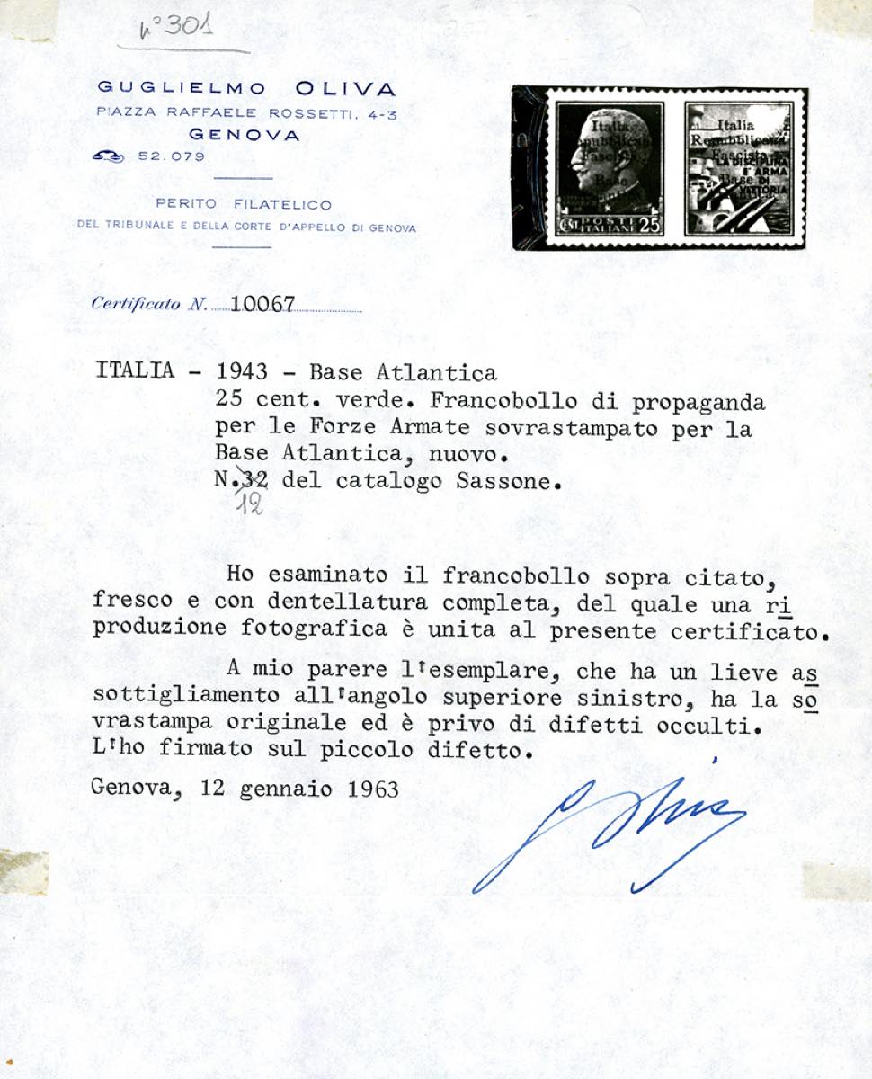 BASE ATLANTICA 1943 - Propaganda di guerra, serie completa con il 30 cent. Aeronautica con doppia soprastampa di cui una capovolta (12/17,18a,19/23), gomma originale, integra per alcuni valori, altri senza gomma, consueti lievi difetti in alcuni esemplari. Conteggio di catalogo effettuato tenendo conto dei difetti e della qualità di ogni esemplare. Insieme estremamente raro. Cert. Diena, Oliva, Raybaudi, Ferrario.