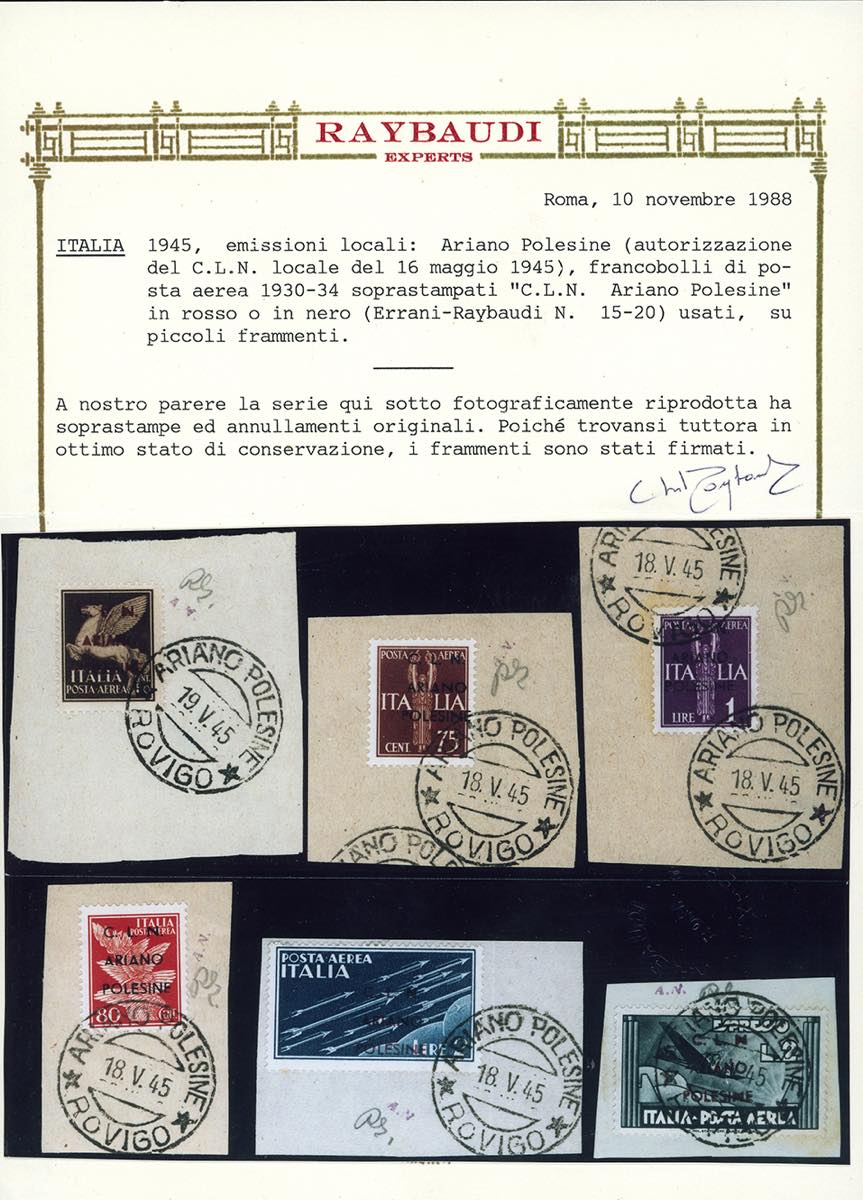 ARIANO POLESINE POSTA AEREA 1945 - Miti e simboli, serie completa, soprastampati (Errani Raybaudi 15/20,Orlandini 15/20), usati su frammento, annulli originale dell'epoca, perfetti. Bellissimi. Una delle serie più rare dei C.L.N., tiratura 19. Cert. Ferrario e Oro Raybaudi.