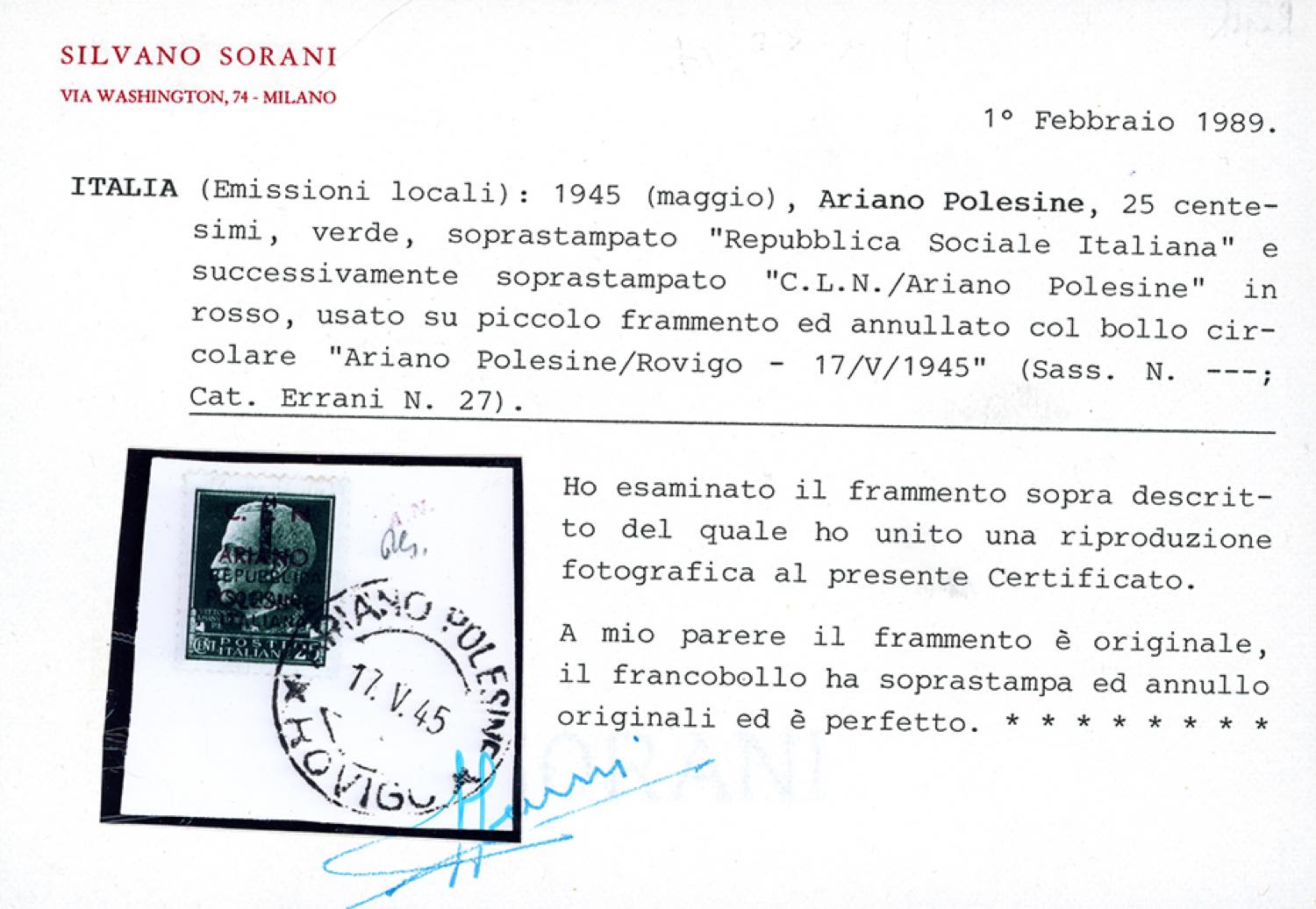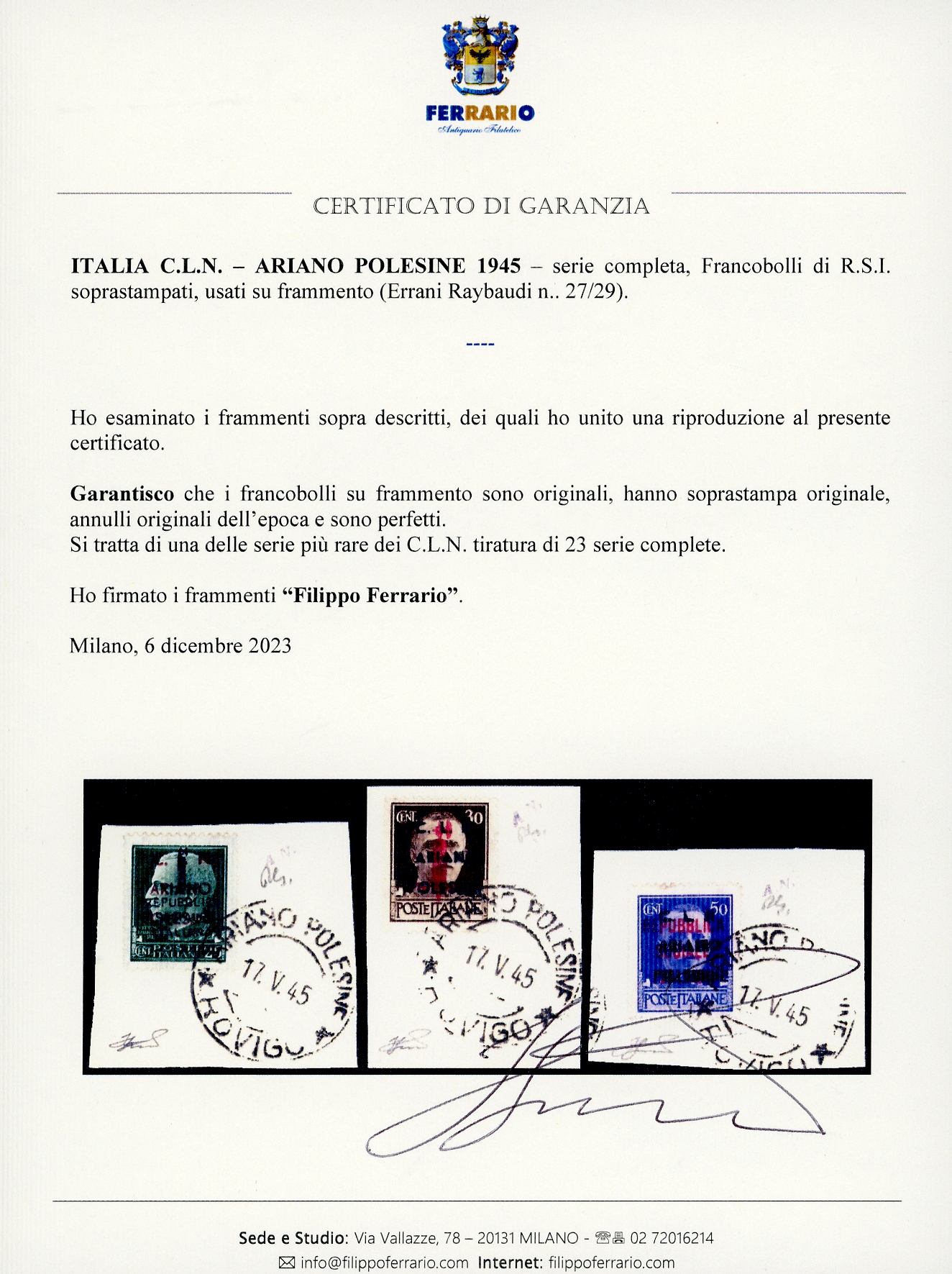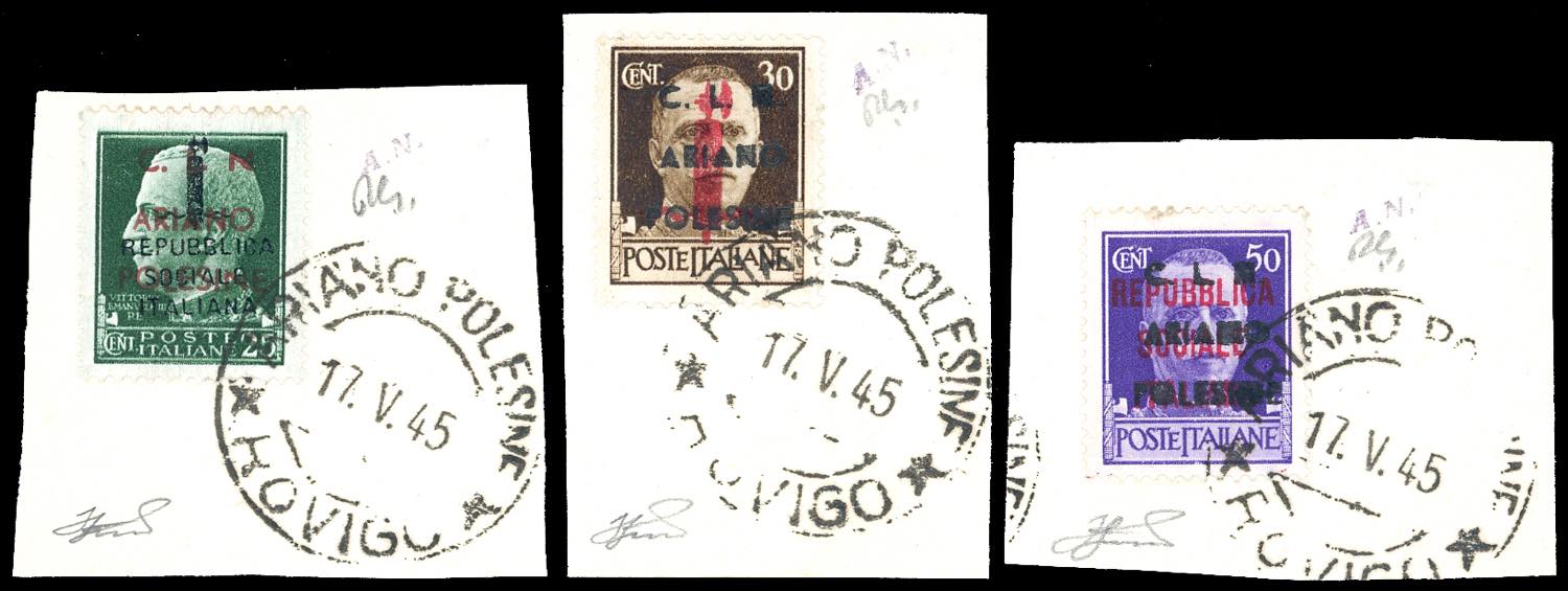 ARIANO POLESINE 1945 - Francobolli di R.S.I. soprastampati, serie completa (Errani Raybaudi 27/29,Orlandini 27/29), usati su frammento, annulli originali dell'epoca, perfetti. Molto belli. Una delle serie più rare dei C.L.N., tiratura 23. Cert. Sorani per l'alto valore, cert. Ferrario.