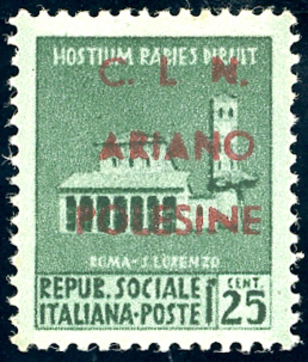 ARIANO POLESINE 1945 - 25 cent. Monumenti Distrutti, con filigrana, SOPRASTAMPA ROSSA (Errani Raybaudi 32A), nuovo, gomma originale integra, perfetto. Molto bello e ben centrato. Pochissimi esemplari conosciuti nuovi. Cert. Ferrario.