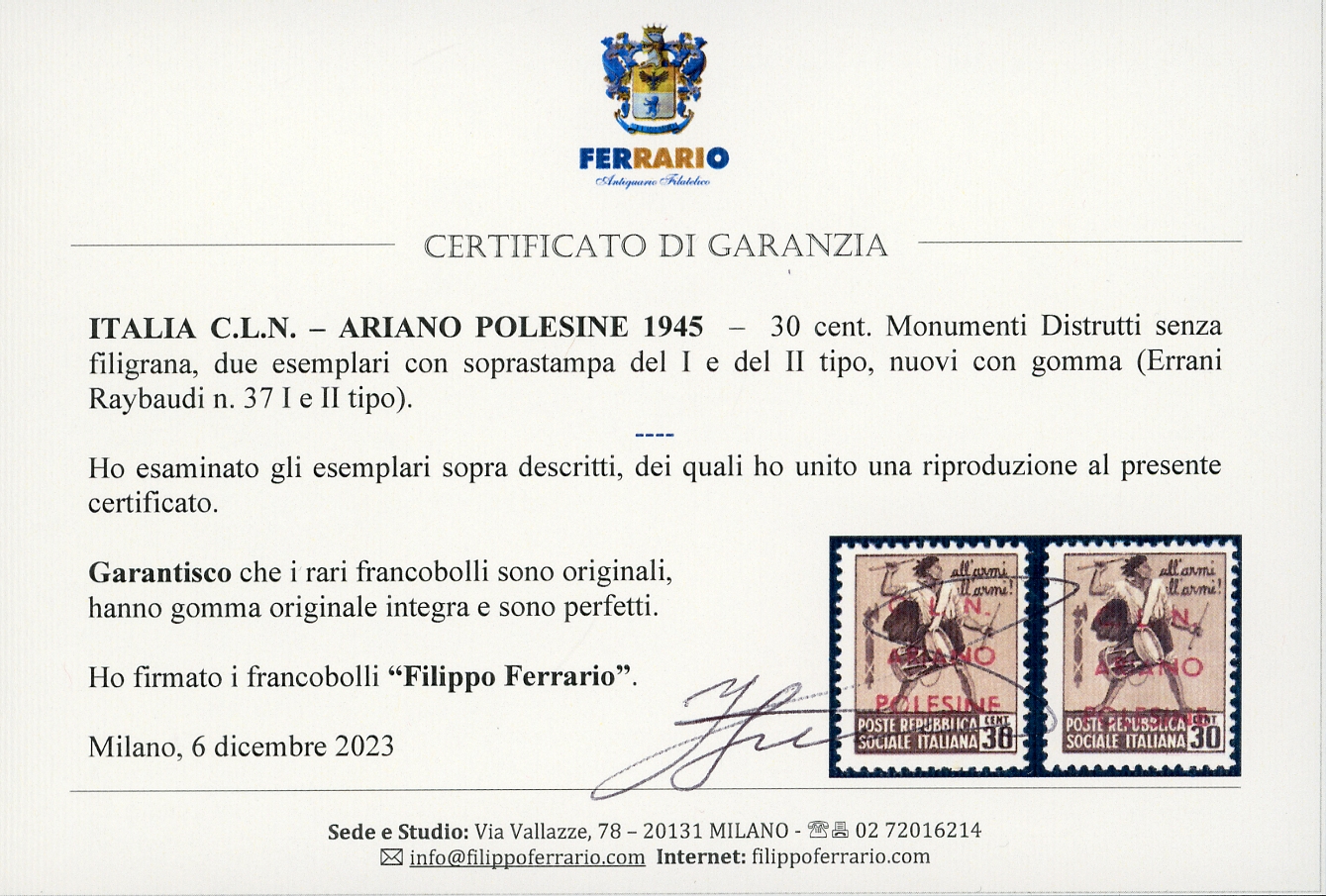 ARIANO POLESINE 1945 - 30 cent. Monumenti Distrutti senza filigrana, due esemplari con soprastampa del I e del II tipo (Errani Raybaudi 37 I e II tipo), nuovi, gomma originale integra, perfetti. Rari, tiratura 35 esemplari per tipo. Cert. Raybaudi e Ferrario.